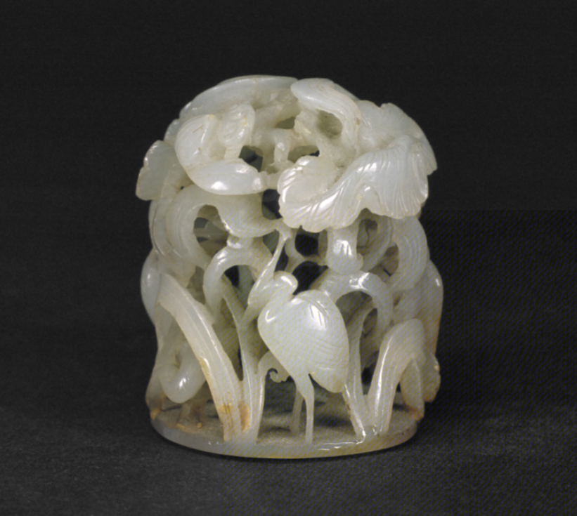 ▲元代 白玉透雕荷叶鸬鹚纹炉顶 故宫博物院藏