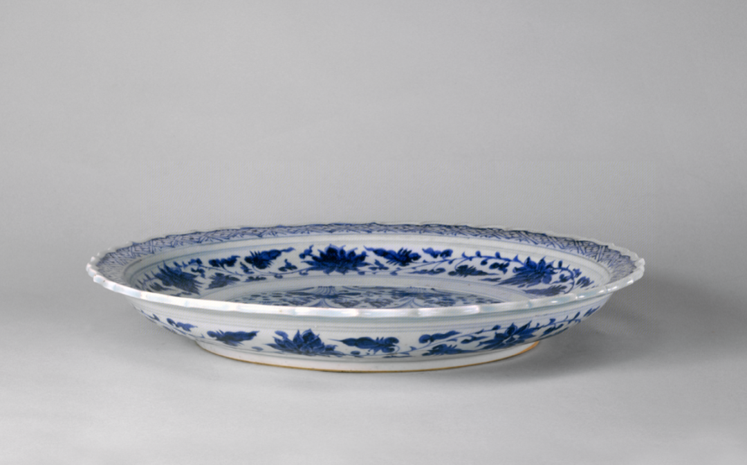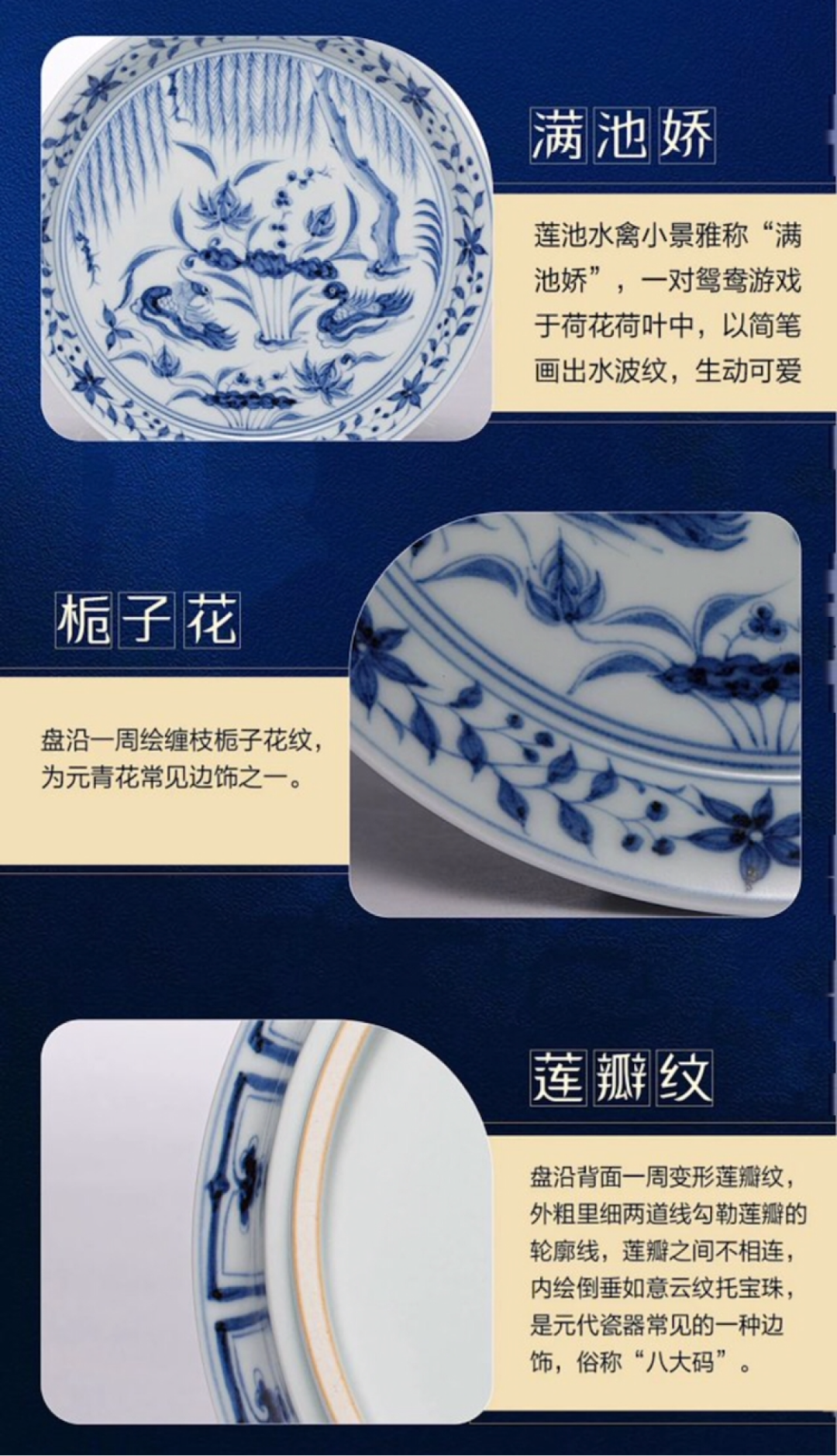 ▲元代 景德镇窑青花鸳鸯荷花(“满池娇”)纹花口盘 故宫博物院藏