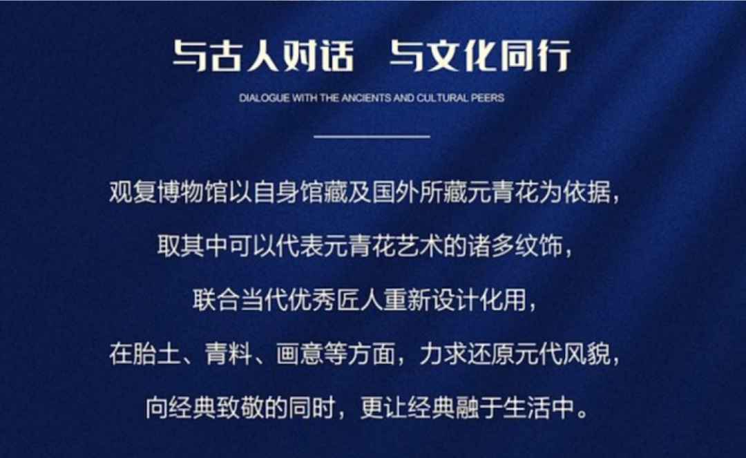 今人爱元青花,其中一个重要原因即是着迷于其上的文化源流溯源,所谓的从一物窥一朝风雅,这是观复博物馆造物的初衷、也是烧造此【幽蓝神采元青花系列赏盘】的初衷: