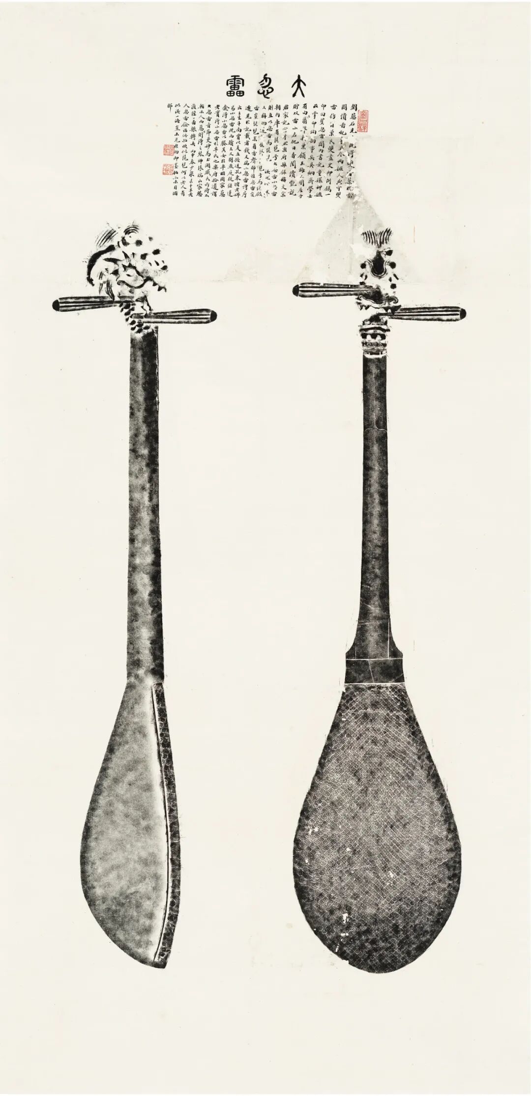 此即为大忽雷之全形,正、侧两面分拓。琴长92.5厘米,腹宽21厘米,观其形:长颈,颈端镶钩形龙首,突目张口,形态生动。龙首山口下有篆书“大忽雷”三字,琴首两侧个置一琴轸。琴颈表面可见所镶象牙片形制。梨形音箱,上蒙蟒皮,蟒纹走势清晰可见。与刘世珩所著《双忽雷本事》所收影像相契合。此种乐器因工艺繁杂,棰拓不易,非常工可为,故拓本罕传。较之今年“敦行故远—故宫敦煌特展”展出大忽雷,未见琴轸,琴颈底端与蟒皮相接处略有出入,且侧面全形可见琴颈上端髹漆之开裂情况,故可窥见其旧时原貌。又韦少泉墨笔小楷恭录十半老人《忽雷余话》,详记大、小忽雷流传始末,佳器善拓,拍场首现。