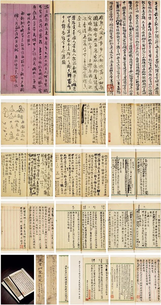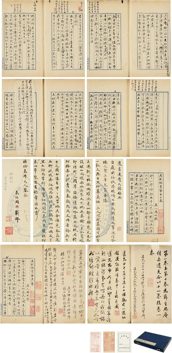 提要:清嘉道间,吴中地区文人风雅,文脉渊长。前有蜚声乾隆的“吴中七子”,后又出现了以朱绶等人为代表的“吴中后七子”,诗歌唱和、书画交谊之风盛行。拍品即为清道光间吴人周旭所撰笔记杂稿。详记其与张问陶、刘松岚、马履泰、朱鹤年诸家招饮之日常,及吴中友人琐事,另乡邦风土、奇闻异事、祝由之术、养生急救之法等。稿中多圈点勾乙及浮签,亦有书眉评注。书于靛青色边栏稿纸之上,书口下镌:“道如未定本”字样,纸捻装,是为手书之初稿,未见刊载。扉页亦收蒋宝龄、齐彦槐、董国华、朱绶、陈光宇、顾桓、陈述祖、蒋志冰八家观款,应为当时交流传阅之作。曾藏上海图书馆,后发还。