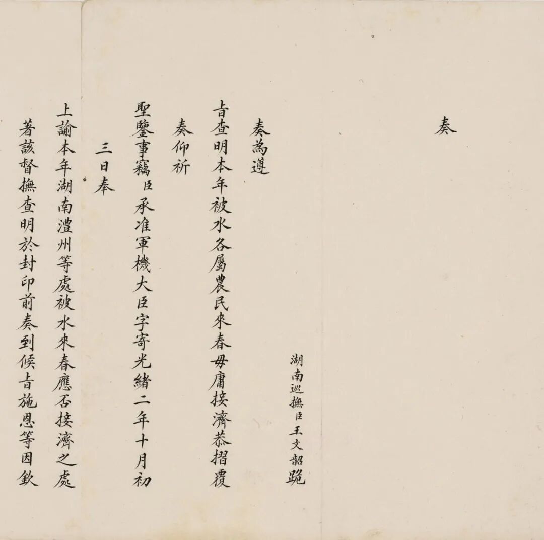 提要:此批奏折作于清光绪二年(1876)王文韶湖南巡抚任内,内容涉及调查湖南澧州等处被水灾情、请示苗疆要缺知县请补、汇报十一月各地粮价及地方积雪情况、核查湖南历年剿办会匪收复城池有功人员、军务建厂制具防患外敌等事务,文中王文韶屡屡自称“微臣”,并一一详报,事无巨细。诸如:“臣当随时留心访察,据实奏闻”等,以表忠心。对研究王文韶生平、政绩及当时湖南地区政治、经济情况有一定参考价值。