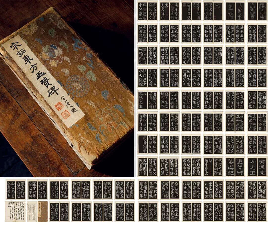 此本黄地富贵福寿纹锦面旧装,开本敞阔,为印康祚、蒋祖诒、古鉴阁主人秦清曾旧藏。秦清曾墨笔隶书题签:“宋拓东方画赞碑”。内页碑文五行“洁其道”之“洁”字尚佳;十行“跆藉势”剜为“贵”字。浓墨乌拓,当为刚剜出之本。又何绍基、许松如二家跋记,皆赞此拓极精,神采奕然。