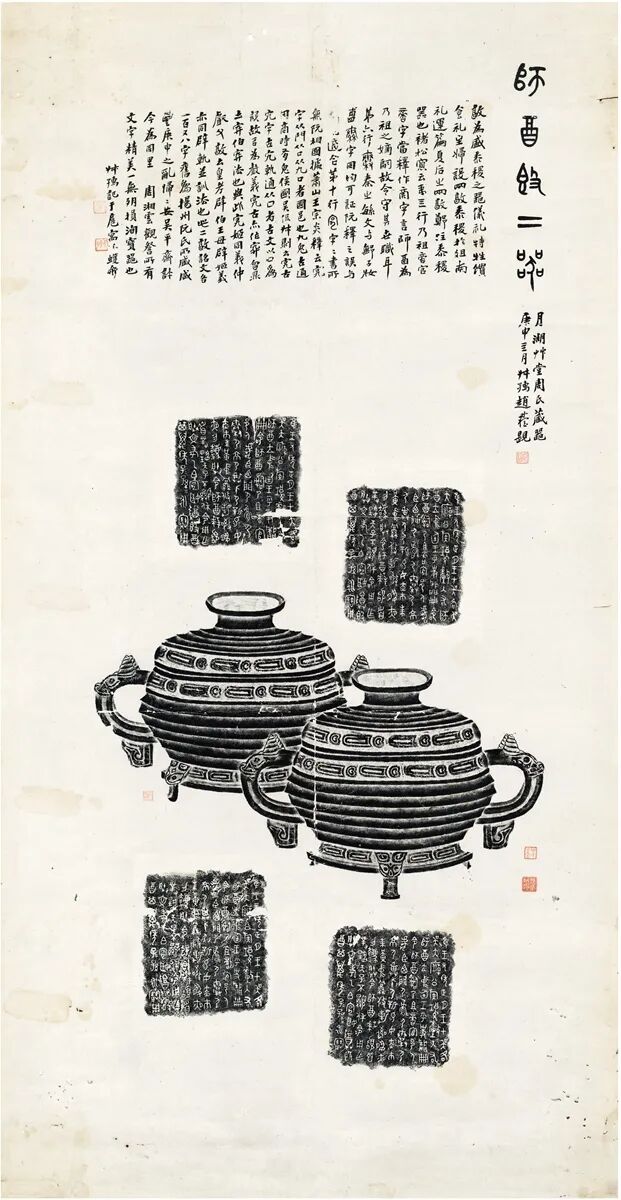 此师酉敦二器全形拓,每器铭文分两纸拓出,器形前后交错拓出,营造出一种立体透视的视觉效果。有民国九年(庚申1920)赵叔孺题名,并长跋考释铭文兼叙此二器之流传,时赵叔孺寓居上海,为海上金石学泰斗。赵氏跋称此二器“文字精美,一无残损,洵宝器也”。