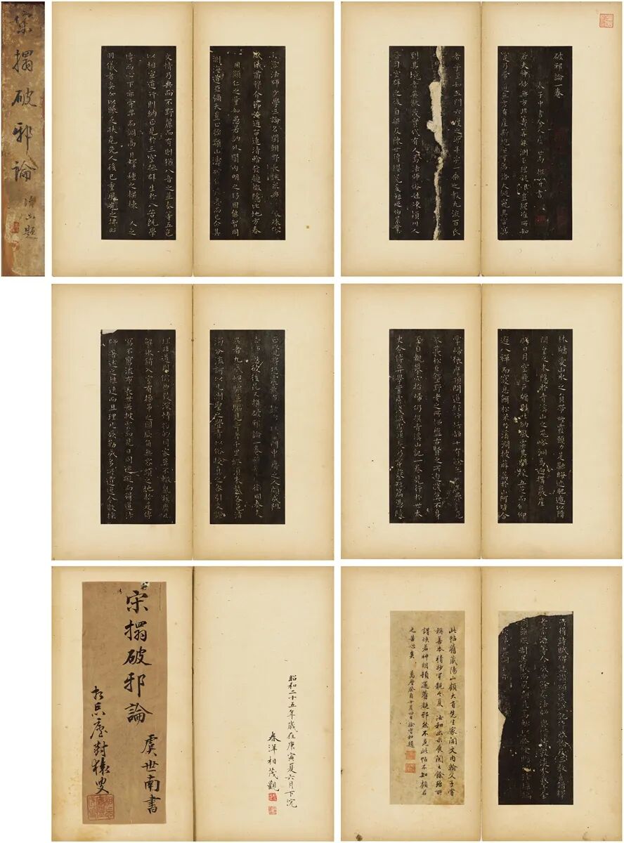 2018年10月,以天价成交的美国安思远藏碑帖十一种中,有宋拓晋唐小楷集册,收入《破邪论序》旧本一件,其第四行有纵向裂纹一道,与此本对比,别无二致,可知二本同出一源,而此帖纸墨黝古,当不在安思远本之下,识者宝之。