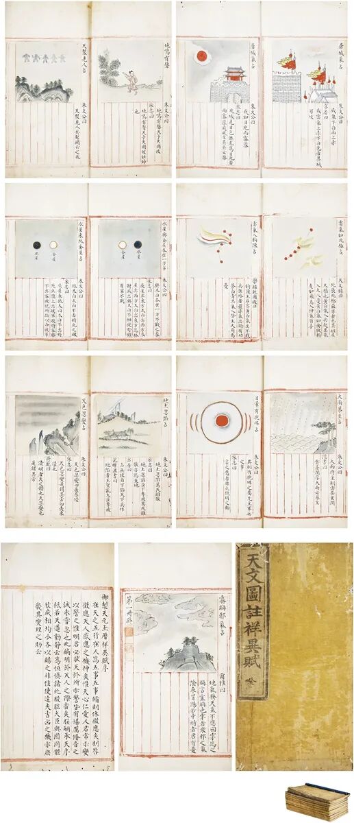 此本卷首收御制天元玉历祥异赋序言及目录,内页分上下双栏,四周双边,双鱼尾,朱丝栏。上栏设色图绘天文异象,下栏抄录解释,文字多引自古籍。绘图色彩明丽,晕染自然,通篇手钞,工整流利,纸质绵白,开本阔达。封面、封底均为黄绫,或为王室宗亲插架之物。