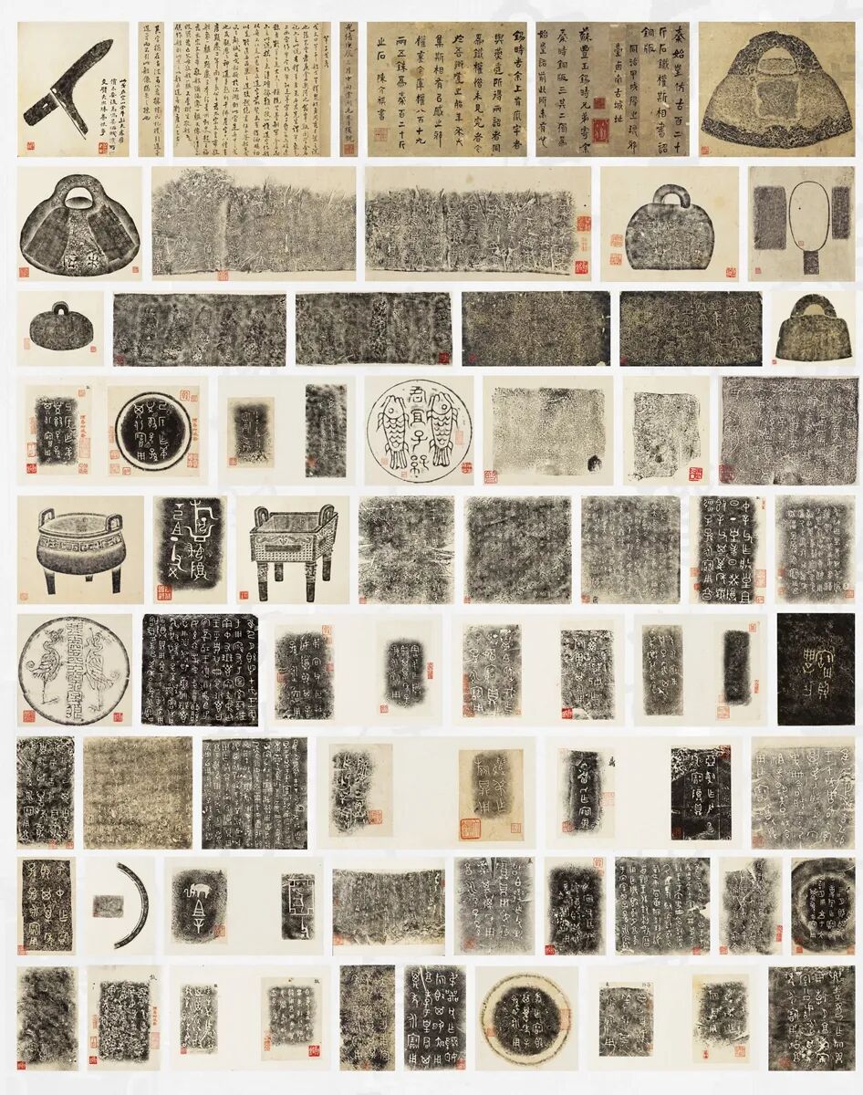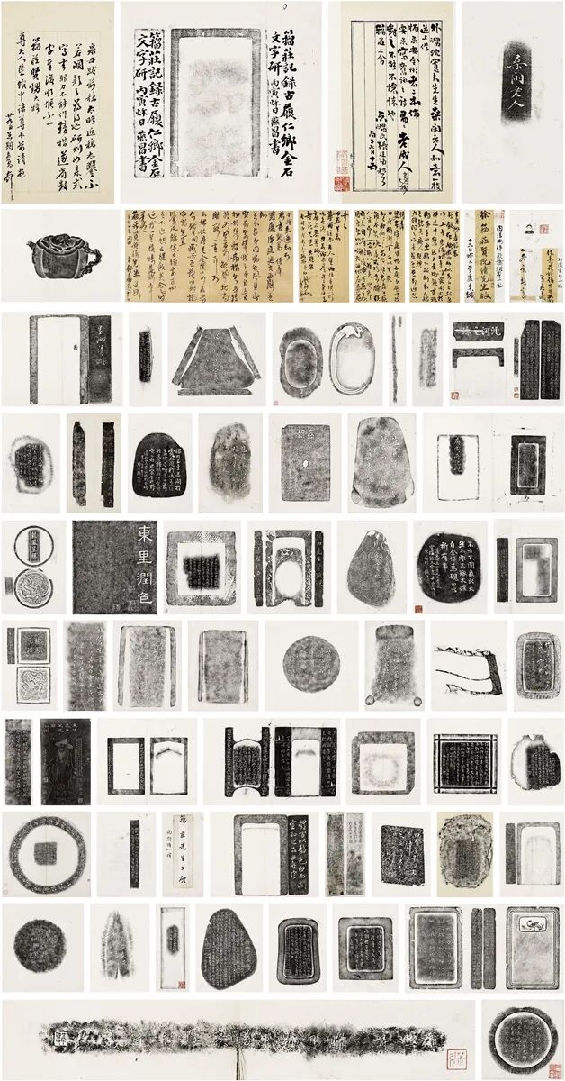 所收如下:沈可培得鼎勒铭拓本、张廷济致徐籀庄关于椎拓“桑闲老人”如意信札一通并铭文拓本、钱天树致徐同柏信札一通附信封、钱天树藏徐渭铭臂搁二种拓、翁方纲铭“承臂于案得筒之半”臂搁拓、“宣示表”铭臂搁拓、张廷济铭《东坡先生笠屐图》拓、《汉阳太守孙雪居像赞》拓、陈震铭崂山赤藤拓、梁同书铭赠张燕昌“秀劲君”手杖拓、陈用卿壶铭、陈铭远为师简堂主人铭壶、梁同书铭赠张燕昌砚拓、陈鸣远制子式先生上款紫泥松鼠柿子壶、知府陈氏作器铭文拓、铜祭器铭文拓、“关防”钟形符拓、明万历玄言阁吴翼明监制墨、吴闻诗为钱谦益制秋水阁墨、明程君房造“龙凤呈祥”方圆墨二种、张燕昌致徐同柏信札有关铭砚并砚铭底稿、文征明题诗及翁方纲题诗石洲西斋摹刻竹节砚拓、张廷济铭“日有星精见于东壁”璞玉砚拓、朱钧嘱张廷济铭张辛刻井田砚拓、翁方纲为沈心醇铭蕉叶砚拓、魏学濂铭砚拓、莲舫嘱张廷济铭野堂砚拓、莲舫嘱张廷济铭荷叶砚拓、向斋嘱未谷(桂馥)作铭拓、梁同书铭“芑堂征君六十小像”砚拓、同书铭砚拓、山舟铭砚拓、“宝正四年七月钱氏作”砖拓、 “庚寅所记砚”拓、翁方纲跋张廷济铭“东里润色”砚拓、山舟为张廷济铭并识汉砚拓、同书铭张廷济藏子产庙碑残石砚拓、徐葆光铭砚拓、曹溶为鹤田先生草疏砚拓、梁同书为无轩铭砚拓、梁同书为柞溪铭并书砚拓、西畯铭砚拓、男翼铭先子著书砚拓、程梦麟徐同柏张廷济三家铭张辛镌字胡秋白藏“洮河之珍”三寿作朋砚拓、朱彝尊铭“质薄气润千秋方寸”砚拓、金德舆嘱李集铭“惰耕村叟片云砚”拓、山舟为芑堂铭“口如池水不缩”砚拓、为质民秀才跋砚铭拓、张廷济为鹿宾铭张辛刻砚铭、杏苑先生老炼师嘱张廷济铭并书、莲峰铭张廷济书砚拓、蔡少峰铭张廷济书砚拓、张廷济为鹿宾铭白圭砚拓、未央宫砖砚拓、张廷济为殷云楼铭张辛刻砚拓、张廷济为石门蔡少峰铭砚拓、明万历沈弘嘉铭砚拓、李文甫制砚铭、青士题“朱彝尊烟雨归耕图”砚拓、千秋识砚铭拓、“朝台”拓、张廷济铭查德尹赠曹廉让“西窗校书砚”拓、松陵潘耒铭砚拓、耻斋铭砚拓、元釪铭林佶书凤鸣砚拓、张廷济为季勤铭并书砚拓、云槎道人属张廷济铭并书张辛刻砚拓、梁同书为张燕昌铭砚拓、朱彝尊铭栖凤砚拓、秋谷珍藏“体方以静”砚拓及“墨池清暇”砚拓、斧形砚拓。