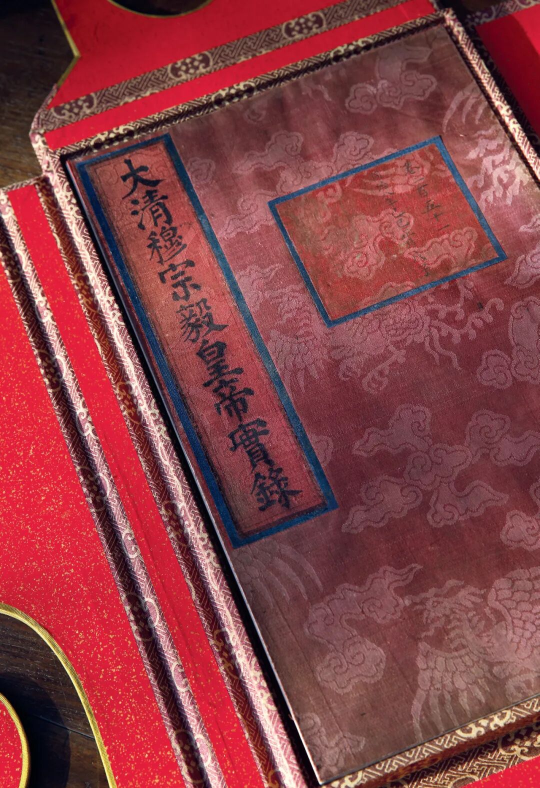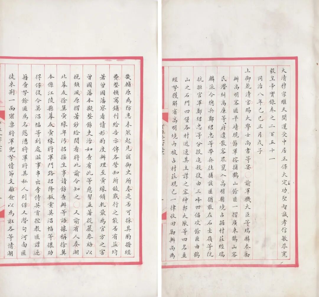 此《大清穆宗毅皇帝实录卷第二百五十一》,半叶十行,行二十四字,朱口,四周双边,画朱丝栏,墨笔恭写楷字,云凤纹红绫面,旧包背装。据考,《清实录》按装潢和开本可分为大红绫本、小红绫本、小黄绫本。又小红绫本为两部,当时一部藏于乾清宫;一部藏于内阁实录库,后内阁旧藏移交 “国府文官处”,散佚。此即内阁缮写小红绫本,记清同治八年(1869)左宗棠驻防江浙、李鸿章布防湖南、王文韶署湖南布政使等事。查《中国古籍善本总目》,《大清穆宗皇帝实录》仅故宫博物院、国家图书馆、南京图书馆等几家公藏机构贮藏,民间流传较罕,故此宫廷旧物,可谓珍宝。