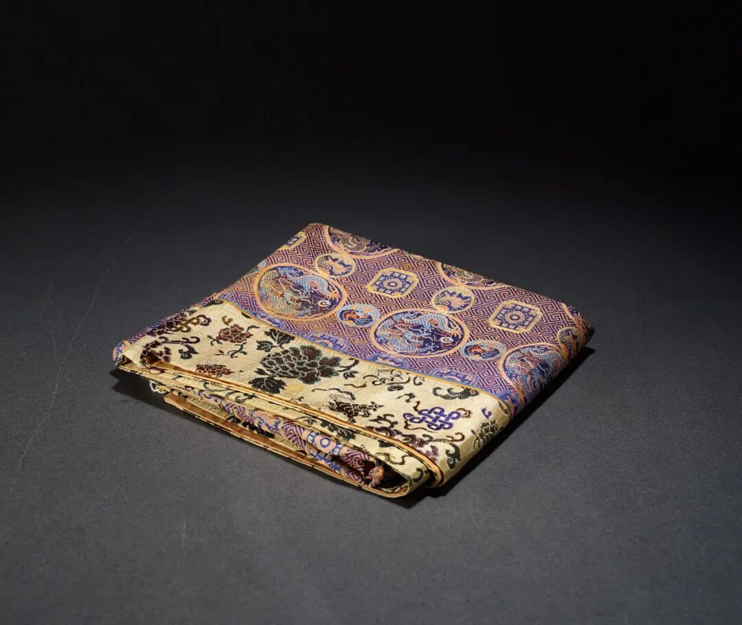 Lot483清·蓝地团龙纹织锦镶八宝边