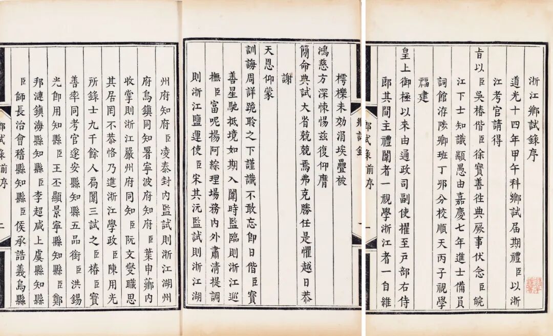 提要:清代科举制度,各省乡试发榜之后,例选场内士子文之佳者刊刻,以供进呈御览,是为乡试录。拍品即为进呈御览之本,初刻初印,纸质莹白如玉,锦面包背装,题签为墨笔恭写“道光十四年甲午科浙江乡试录”。据《钦定科场条例》载,“各省乡试录,移送礼部,汇齐恭呈御览”,清代各地呈览的乡试录,均保留在内阁大库,清末民初,方有零册散入民间。故此进呈本以其刷印精良,装帧考究,且经清宫旧藏,非一般普通本可比,市面流传绝少,弥足可珍。