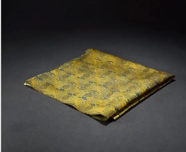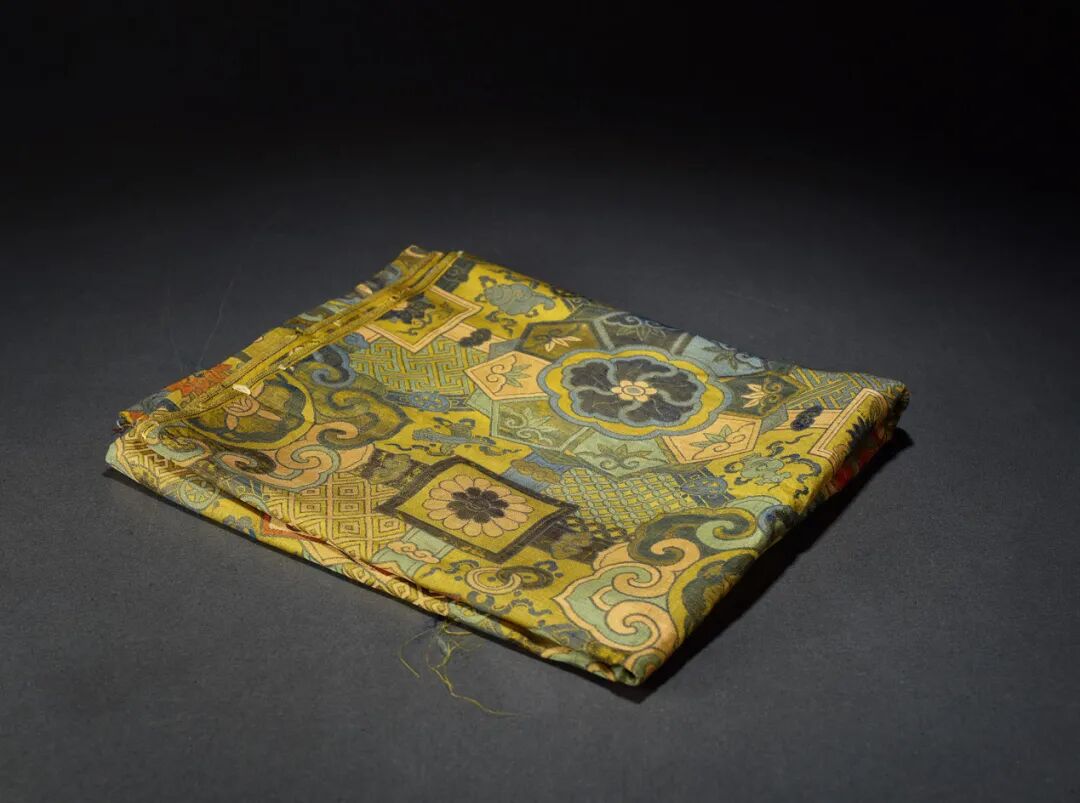 2.黄地云纹如意织锦方巾,1张,镶边,有覆背,尺寸:33.5×37cm。