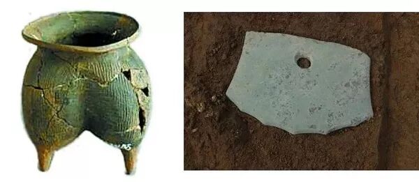 这片墓葬出土了这么一件鬲(左),这就是典型的商文化的东西。然后又出土了这么一件钺,这是一件石钺,刚好是相当于我们说的二里头文化、也就是夏文化这个阶段的东西。这就证明这些东西的年代跟夏王朝的年代差不多,也就是说刚好它的年代比商王朝要早。