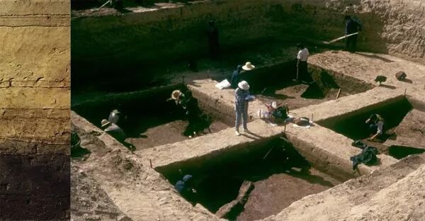 商丘地区被淤了,不好找。淤到什么程度?你看这张图,3000年前的地面是在地底下。左边是一条长长的剖面,从上到下多少米呢,一般情况下十米。也就是说,十米的堆积,这以上全是后来的。我们在十米的地方还能挖得到明代跟清代的瓷片,真正商朝的东西是埋在十米以下的。