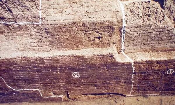 其实城墙是有规律的,跟着这个起始点一钻探,就把整个城墙钻探出来了。这是当年城墙发掘出来的一个剖面图。