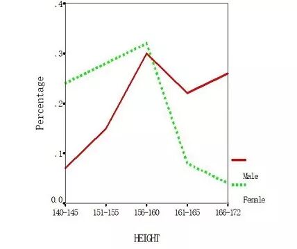 可是女的也就是绿线所代表的那一部分,160cm以下的比例明显就高于男的,160cm以上远远地低于男的。这个X轴的最大值,在这个表里头是172cm,也就是说商代的人超过170cm的男的也不是特别多,女的到170cm那已经是凤毛麟角了。这个表反映出商代人的身高比今天要低。
