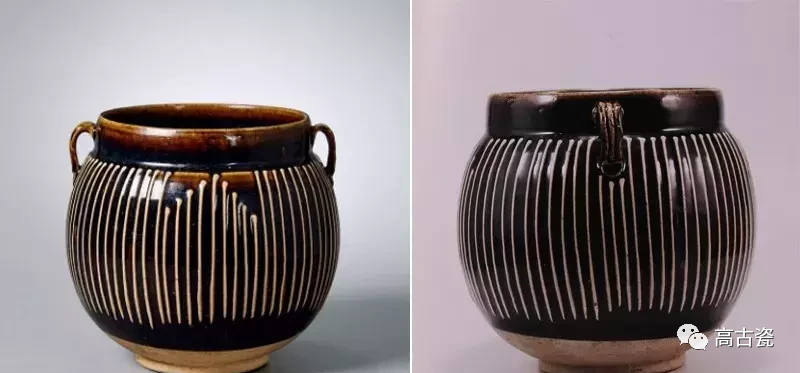 此罐圆唇,短颈而直,丰肩腹鼓下收,罐身似倭瓜,肩颈之间粘贴双耳。腹部装饰筋线如起棱,线条自然而有力,深具天然淳朴的气息,釉汁乌黑光亮,流釉自然,与浅黄色的胎体对比鲜明而愈显黑釉的浑朴质感,大方而庄重,彰显出一份不可言喻之美,在日本関西美術競賣株式会社 2016年东瀛集芳—瓷杂、文房专场中,lot 1687 黑釉线条罐及保利香港 2015 年夏季拍卖会,安思远旧藏古代瓷器专场,lot5018 淄博窑线条罐皆为类似器,可供参阅。