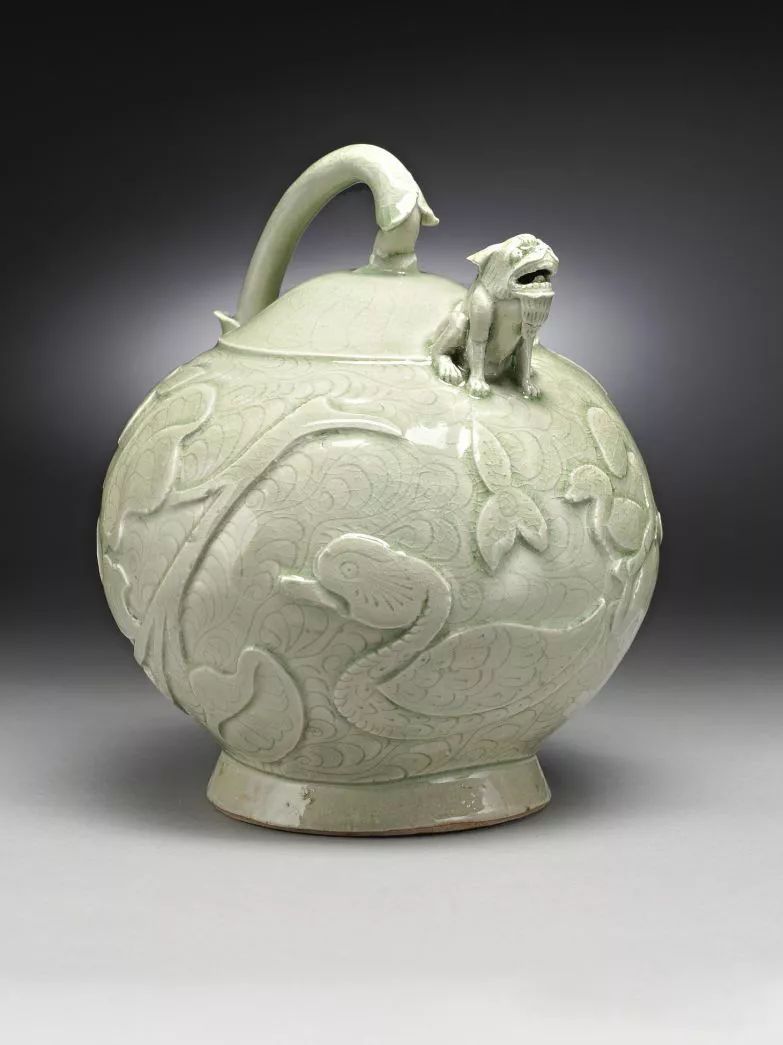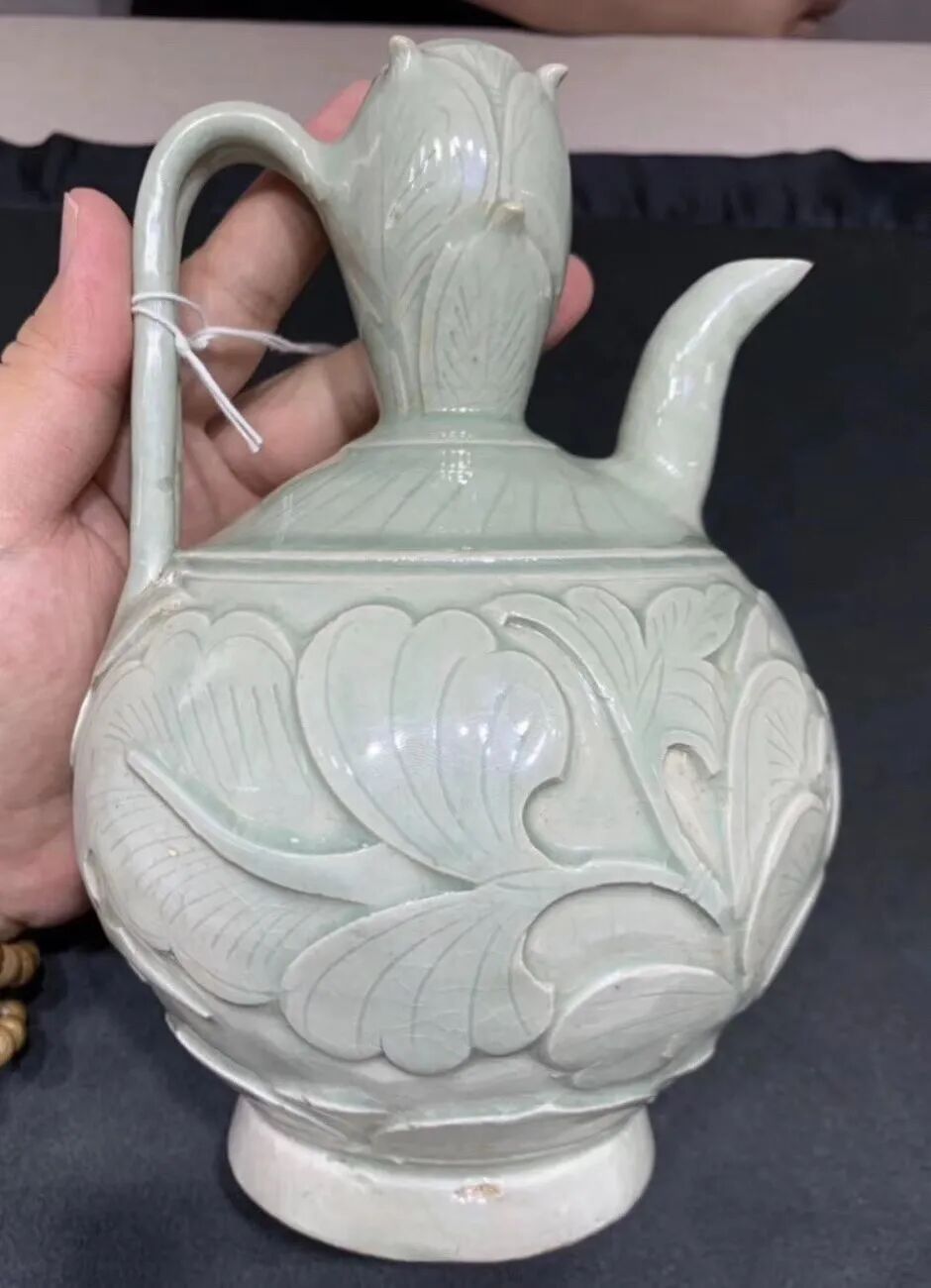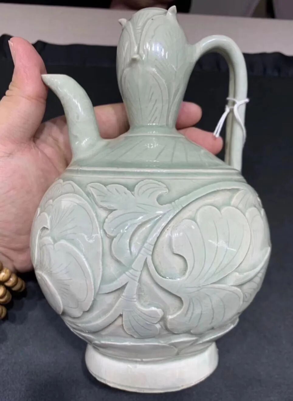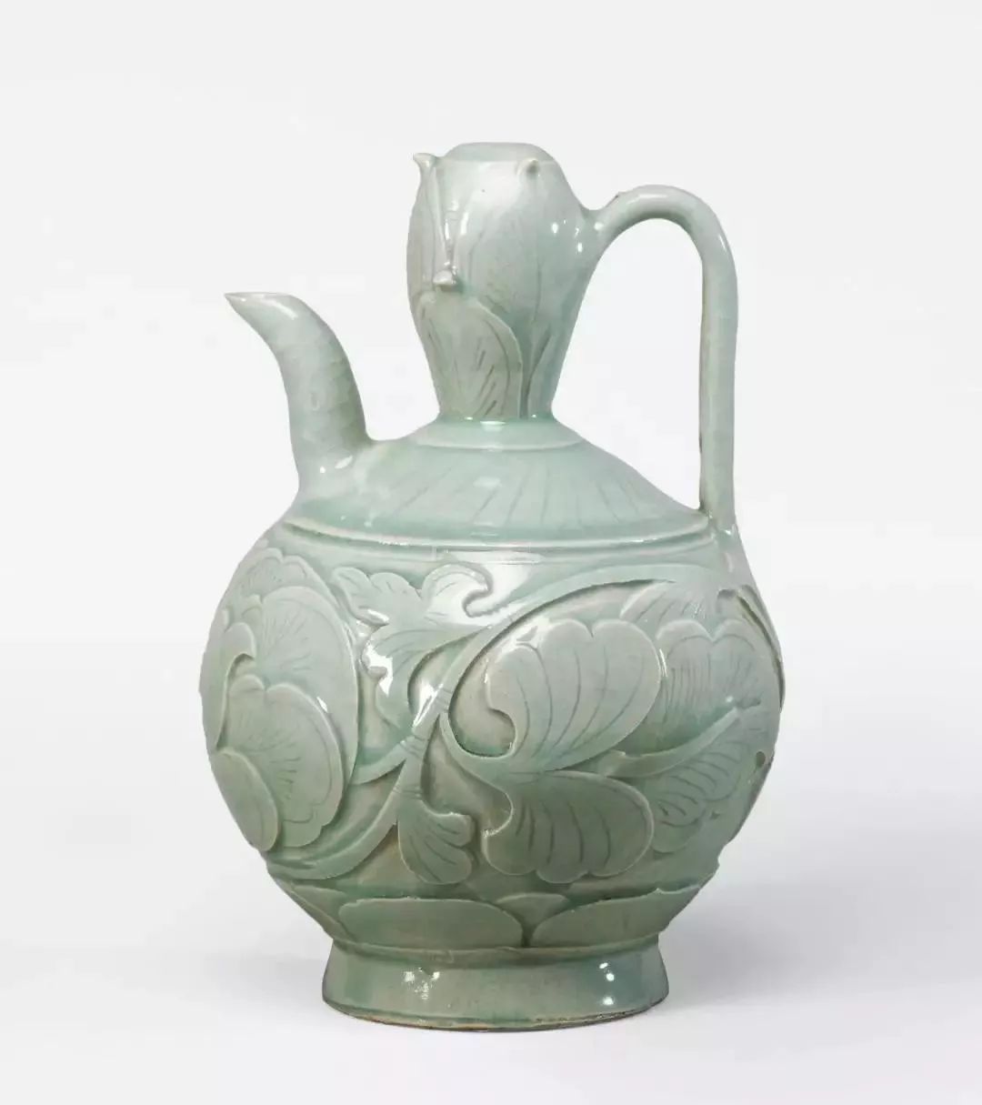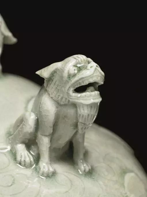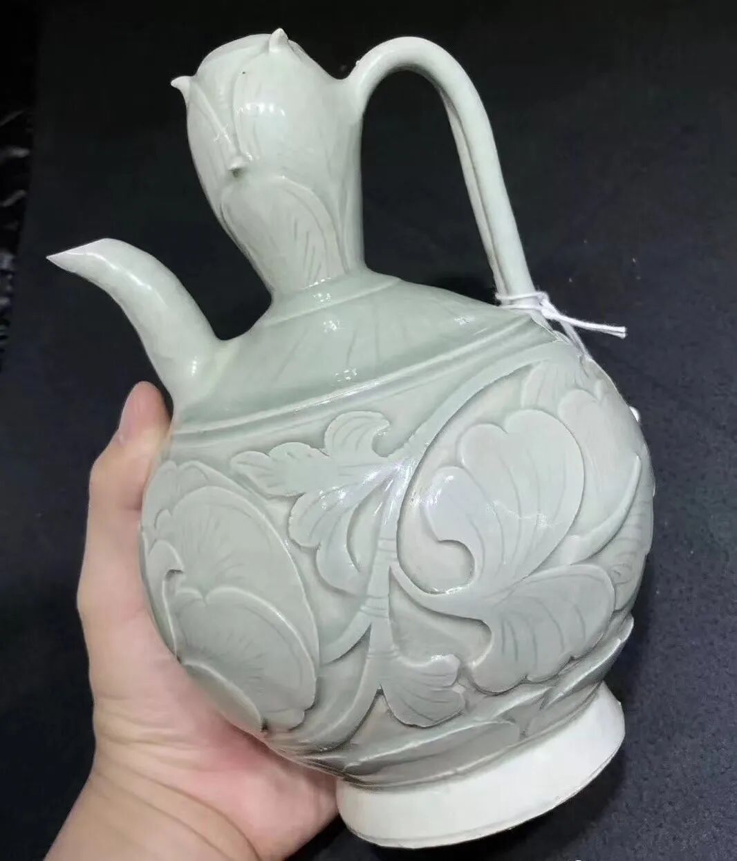 这类五代至北宋的耀州浮雕风格的壶,在拍卖中的成绩都很好,壶没有盖,从整体结构来看,应该是需要从壶底注水,从狮流出水的耀州窑魔壶——倒流壶。