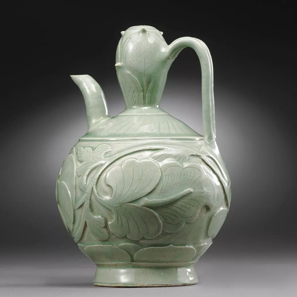 这件2007年成交的北宋耀州窑执壶,最特别指出在于其葫芦造型,和青绿的釉色。瓶口还有逼真的花苞造型,充分展现的耀州窑匠人塑形能力。