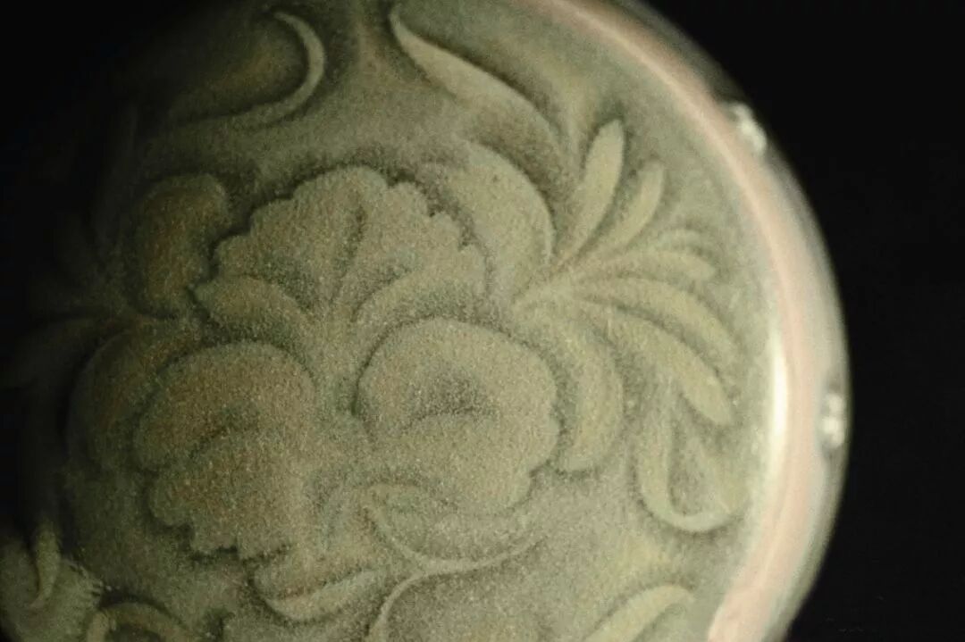 这对斗笠碗和上面的净瓶出自同场,牡丹纹饰是耀州窑瓷器中最常见的一种,构图饱满,布局得体,刀法犀利,线条流畅而奔放;陪衬纹饰,纤细如丝,排列有序;整体纹饰层次清楚,繁而不乱,刻棱处积釉色深,使花纹凸起,有浅浮雕装饰效果。