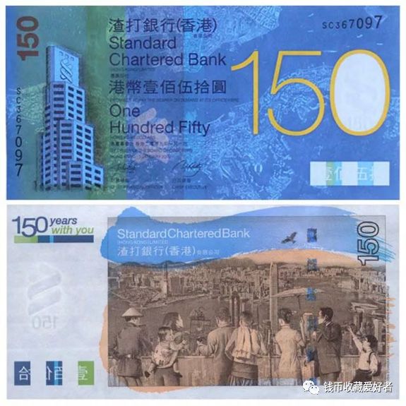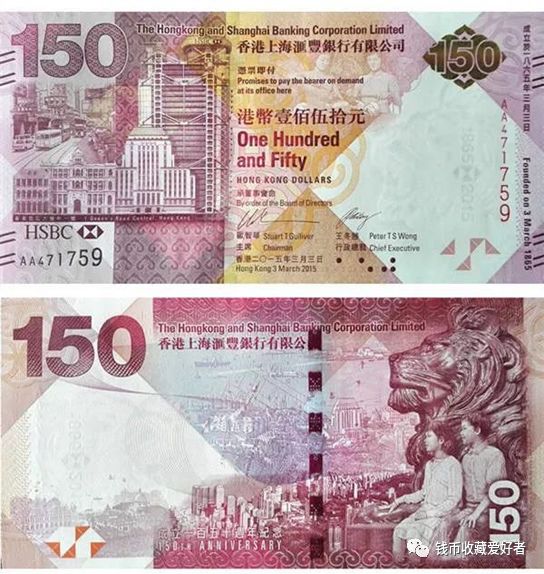 香港汇丰银行为庆祝成立150周年,于2015年3月3日发行200万张面值150港元的纪念钞票。该钞票主色调为酒红色和金黄色。该纪念钞采用了多幅精选历史图片,描绘出香港和汇丰在过去150年所经历的时代变迁,包括1874年的中区地图和当时皇后大道的街景,钞票水印为汇丰银行门前的铜狮子“史提芬”。