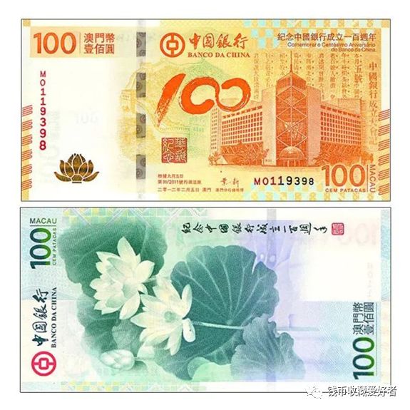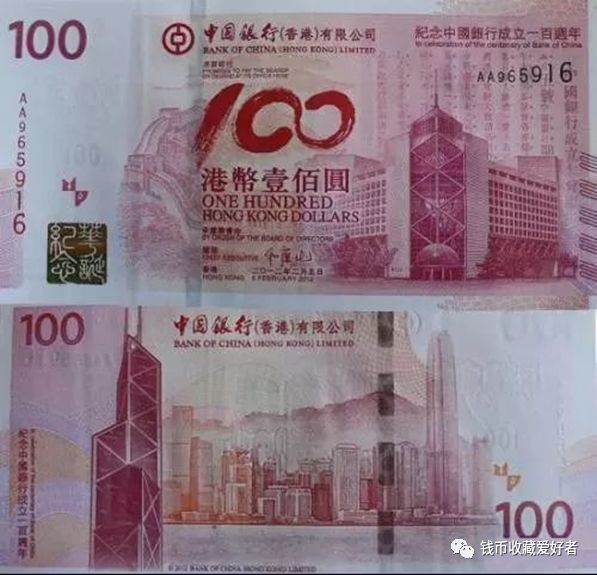 这张是“新中银”纪念钞,因为2012年还有一张“老中银”。两者区别在于:“老中银”是中国银行成立100周年;“新中银”是中国银行香港分行成立100周年,也叫中银在港服务百年纪念钞。纪念钞发行量为500万张,为香港纪念钞数量之冠,发售品种分为单钞、三连张及三十连张。