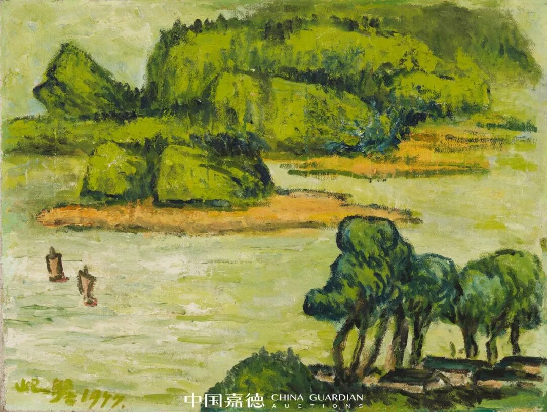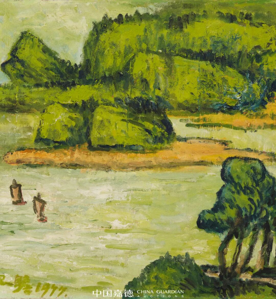 朱屺瞻享寿一百零五春秋,作为中国近代画坛大师级人物,美术界对他的印象即是中国画大师,但很少有人知晓,朱屺瞻早年间分别于二十六岁、四十五岁年纪两次东渡日本学习油画,与陈抱一、卫天霖、倪贻德、关良皆师从著名画家藤岛武二。青年时期的朱屺瞻着迷于印象派绘画,通过东洋学习及影响,后期运用马蒂斯式的表现风格,融会中国式意象,尝试绘制了大量实验性质油画,着力于油画创作多年。在1920年代上海“天马会”每年举办的画展中,皆能看到朱屺瞻的身影,他与刘海粟、徐悲鸿、王济远等人一起进行艺术探索,朱氏曾担任新华艺专绘画研究班主任,直到五十岁后,才主攻中国画。遗憾的是,朱屺瞻的油画作品曾历经两次毁灭性“劫难”,因经历重大变故,全部作品无一幸存,朱氏痛心放下油画笔,开始潜心研习中国画。朱屺瞻的油画创作自1949年后中断约三十载,直至1977年,朱屺瞻以八十六岁高龄,重拾油画创作,可谓与明代谈迁撰写《国榷》经历相似的油画大师。此次现身嘉德秋拍的《秋岚暮艳》与《春帆翠峦》为朱屺瞻晚年所作,其现存油画极为稀有,这两件臻品源自家属与朱氏好友简庆福旧藏,实属难得。简庆福是中国著名摄影大师,1942年入上海美术专科学校学习西画,师从刘海粟、张充仁。1980年代曾在上海开办彩色摄影技术培训班,促进了中国彩色摄影的普及。朱屺瞻《春帆翠峦》局部