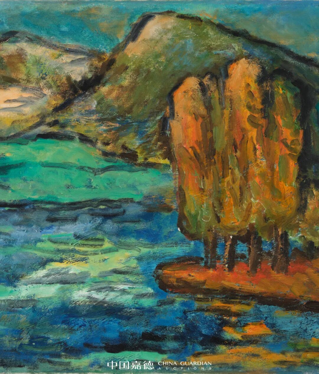 因战火及散佚等特殊原因,朱屺瞻毕生留存的油画数量不足20件,除两幅收藏于上海朱屺瞻纪念馆以外,其余多为家属及国内外重要私人藏家珍藏,鲜少现身二级市场。本次秋拍有幸囊括家属来源《秋岚暮艳》与朱氏好友简庆福旧藏《春帆翠峦》两幅油画臻品,洵属难得。