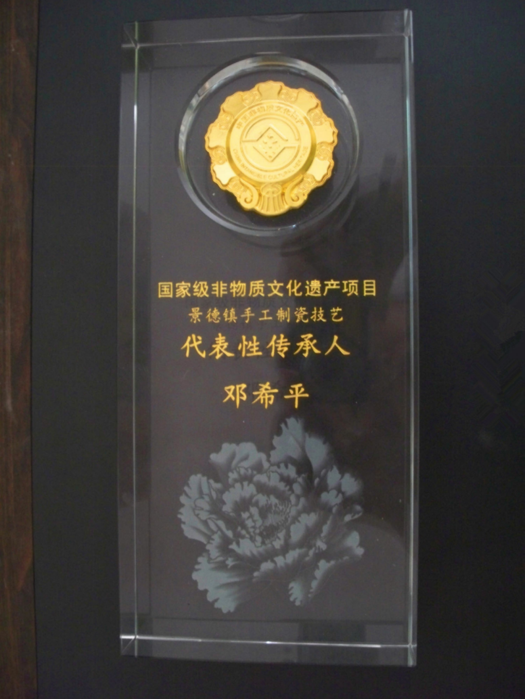邓希平,景德镇市建国瓷厂总工程师,陶瓷工艺高级工程师,享受国务院特殊津贴,国家有突出贡献中青年专家,1999年获国家人事部杰出专业技术人才一等功,2012年批准为国家级非物质文化遗产项目景德镇传统颜色釉瓷烧制技艺代表性传承人,2013年获中国陶瓷艺术设计、教育终生成就奖。2014年获中华非物质文化遗产传承人薪传奖。