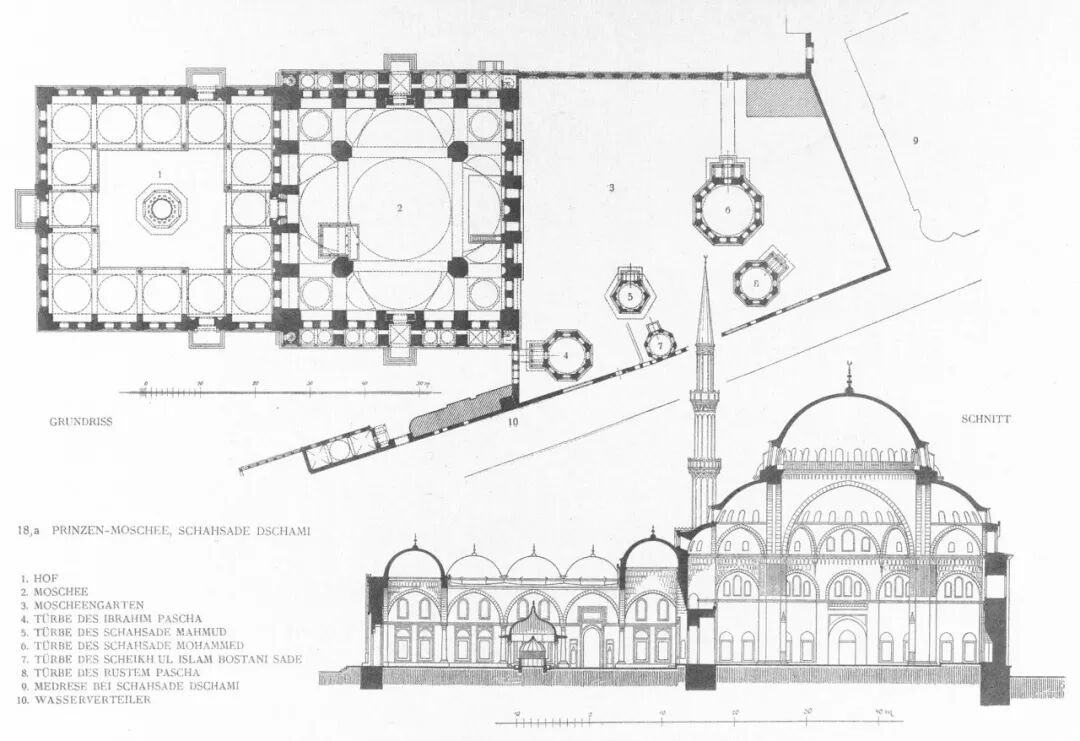 ▲《金角湾的新清真寺和圣索菲亚清真寺》,1838年,版画锡南的建筑学天赋得到了苏莱曼大帝的赏识,担任了宫廷建筑总监,毕生设计了335座大型建筑,光是清真寺就有79座之多。这些清真寺基本都是从圣索菲亚教堂的空间构造汲取的灵感,其中最能代表锡南早中晚三期特色的有泽扎德清真寺、苏莱曼清真寺、赛里木清真寺。![]()