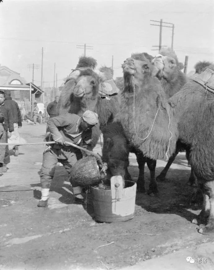 北京街头的赶驼人正在用柳罐给骆驼打水喝