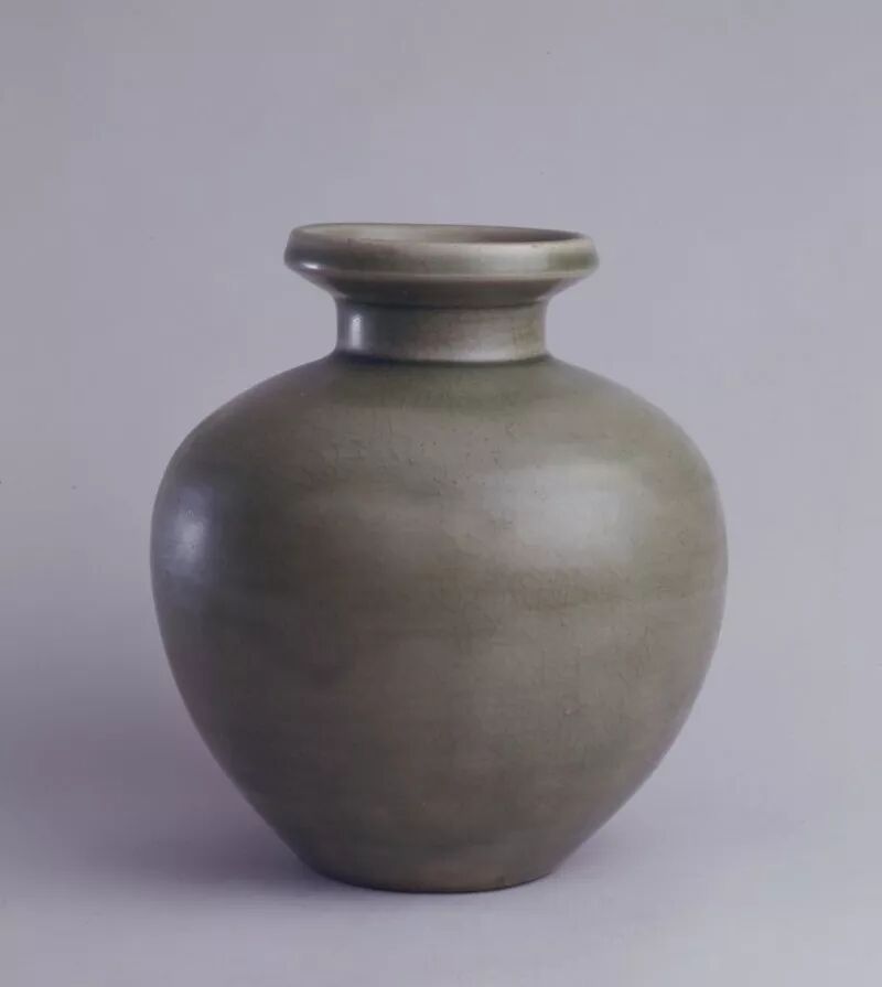 耀州窑瓷器中瓶式很多,瓶体或修长秀丽,或丰满端庄,但像此件石榴式样的瓶却较少见,应为北宋早期产品。这时期耀州青瓷釉面皆玻璃质感强,施釉均匀,大多开有细碎片纹,胎釉结合紧密,没有剥釉现象。品种以日用瓷为主,造型方面与五代耀州窑瓷器有明显的继承关系。
