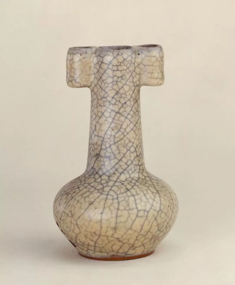 此瓶在造型上摹仿西周青铜礼器。口耳相连的曲线增加了口部力度,与扁圆形腹部上下呼应,构成视觉上的均衡,给人以稳重之感。通身细碎开片,静穆、优美。