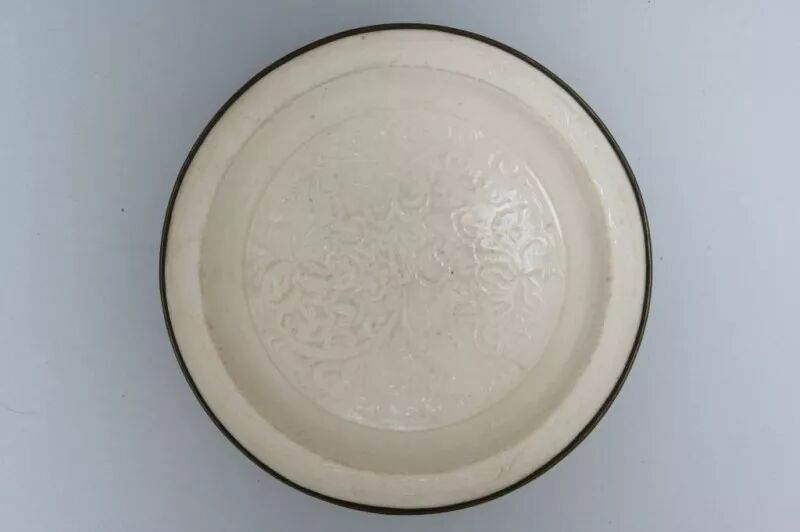 盘折沿,浅腹,浅圈足。通体施白釉,器口无釉,镶铜口。近口沿处刻划卷草纹一周,内底刻划缠枝牡丹纹,其上结两朵牡丹花,花心相对。