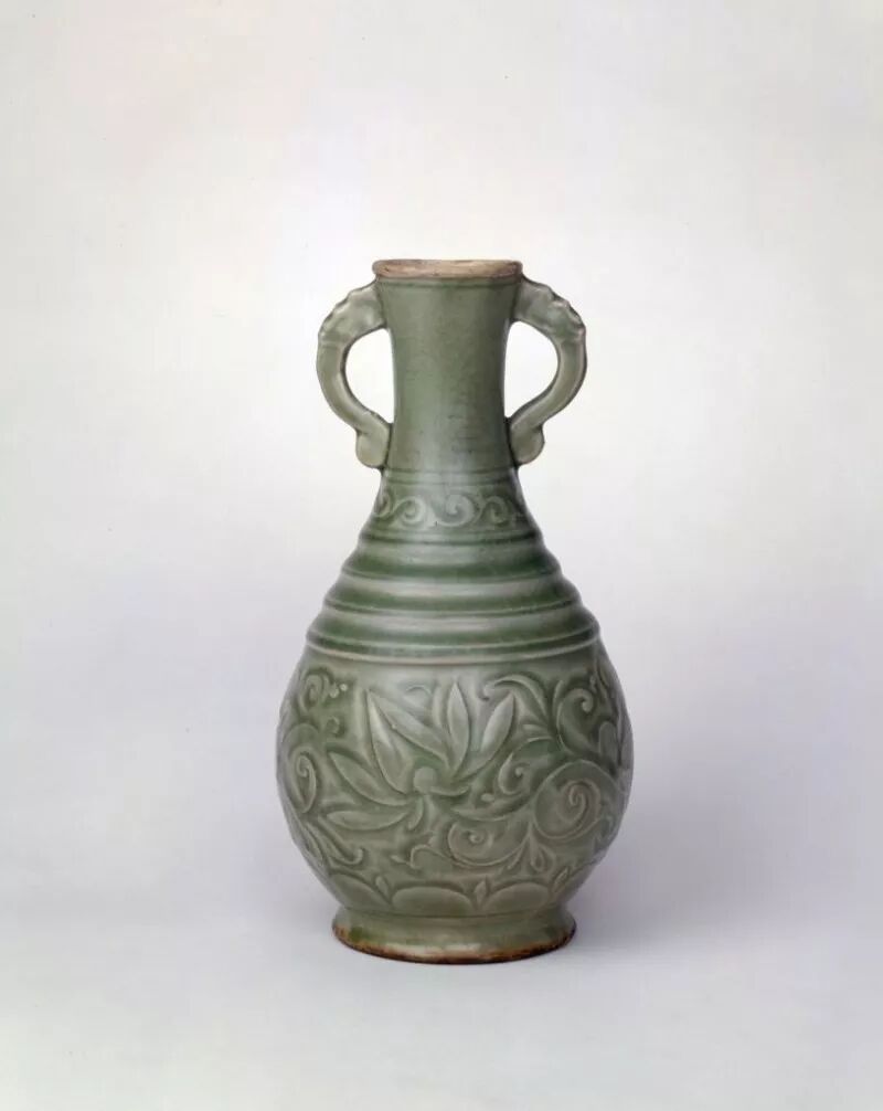 耀州窑青釉刻花莲花纹双耳瓶,宋,高24.5cm,口径5.5cm,足径9cm。