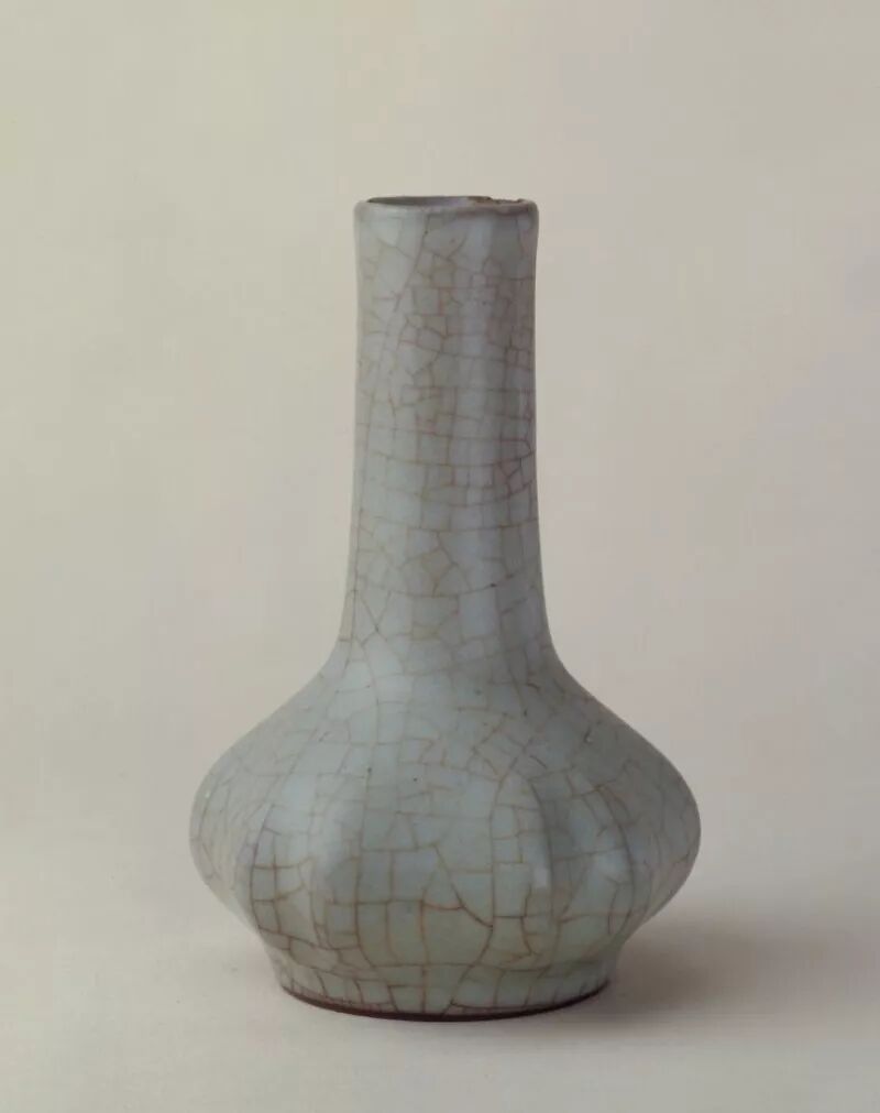 瓶直口,颈部细长,腹部由凹凸的棱线形成似蒜头状的形体,圈足。通体施青灰色釉,釉面开片,开片较大且遍布器身。