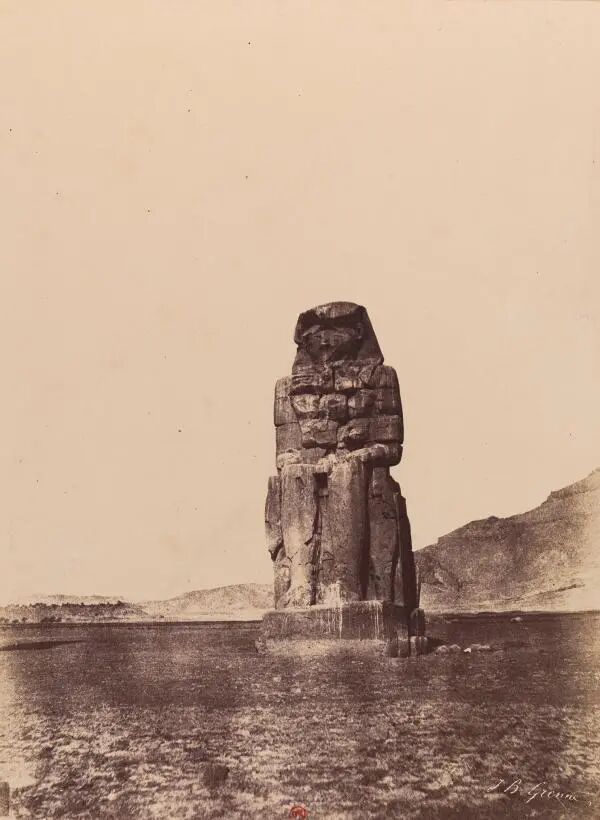 从照片中隐约透出的忧郁中,也许可以想象格林对于自己的早逝已有预感。在1854年的一幅底比斯城法老的石像照片中,巨大的雕像从沙漠中耸立而出。石像曾经守护着一座敬拜法老的庙宇。这座宏伟的建筑早已被地震洪水所吞噬,只留下了它的守护者。格林拍摄了石像的正面,他从低处仰视那被时间侵蚀的面庞,那张毫无表情的脸茫然地回望着他。