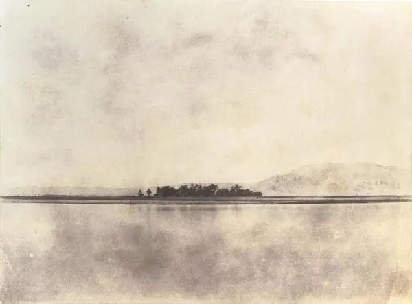 格林最常被复印的一张照片是1854年《底比斯城的尼罗河畔》(Banks of the Nile at Thebes),这张风景照展现了无与伦比的美。构图分成了三个水平区域:上方的天空占据了超过一半的画面;下方的河流缀着大片的斑点,也许是岸边的映像;中间薄薄的一层是岛屿和棕榈树丛。远山和近处的河水呈现同样的色调,浮于水天之界上。