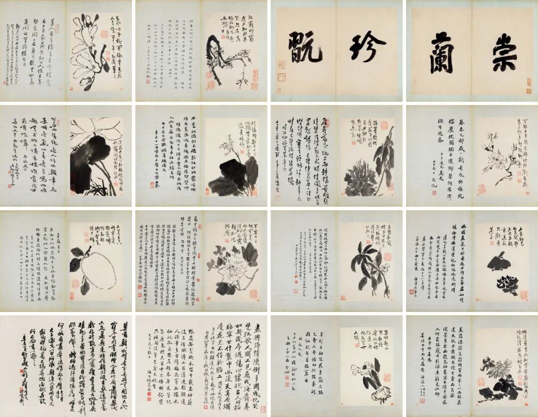 【画心】26×17.5 cm×12约0.4平尺(每幅)【题跋】35×23 cm×16约0.7平尺(每幅)拍品估价:800,000 - 1,000,000 人民币1.《泰山残石楼藏画·颠道人花果册》,民国珂罗版。2.《南画大成》第二册,第349页,第三册第526、685、704页,第四册第751、752、782页,1935年。3.《泰山残石楼藏画》内页,丸孙商店出版部,2019年。《大风堂藏书画展览目次》“七六 颠道人花卉”,1946年。《张大千藏品展》第76号,1946年4月17日至26日,成都。1.高邕、唐熊、张大千递藏。唐熊(1892-?),字吉生,新安(今安徽歙县)人。家学渊源,其母吴淑娟(杏芬老人)工画。唐熊书画皆精,鬻画沪上,颇著声名。2.郭尚先题册首。郭尚先(1785-1832),字元开,号兰石,福建莆田人。嘉庆十四年(1809年)进士,历任乡试考官、国史馆纂修、文渊阁校理、四川学政、左赞善、光禄寺卿。3.黄宾虹、吴湖帆、溥儒、王师子、谢玉岑、陈定山、王个簃、潘飞声、汪旧游、顾飞、向迪琮、李釋戡、经沅等十五人题跋。颠道人[清]道士。江宁(今南京)人,相传胡姓,明亡为道士,流寓维扬(今杭州)。山水洒丽,花卉奇古,书法学李鱓,诗画俱有石涛( 原济)风度。有颠道人上天图,现藏南京博物院。