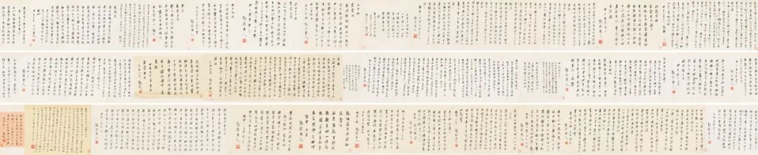 尺寸:38.5×1730.7 cm,约 60.0 平尺拍品估价:2,600,000 - 3,500,000 人民币题签:蠲戏老人编年诗卷,甲午至丙申,及门刘 ( 下残 )1.《中国当代理学大师马一浮》第 258-260 页,上海人民出版社,1992 年。2.《马一浮集·三》第 561-597 页,浙江古籍出版社,1996 年。3.《江苏行政学院学报》,2005 年第 2 期。4.《马一浮评传》第 144 页,百花洲文艺出版社,2010 年。5.《马一浮全集·第三册下》第 455-485 页,浙江古籍出版社,2012 年。1. 本卷集中了甲午(1954)、乙未(1955)、丙申(1956)三年间马一浮与蒋国榜唱和所作的诗文。2. 上款人“苏盫老友”即蒋国榜(1893-1970),字苏盦,江苏南京人。工诗文,书师汉魏, 喜好金石、书画、碑帖等。宣统年间购廉惠卿所有“小万柳堂”,改建屋宇,易名为 兰陔别墅,俗称蒋庄。平素乐助公益事业,后入马一浮门下,为马氏建国后仅收的两 弟子之一。1950年,马一浮应蒋国榜邀请在蒋庄居住 17 年。