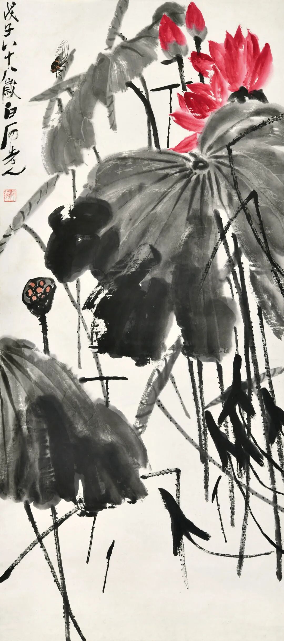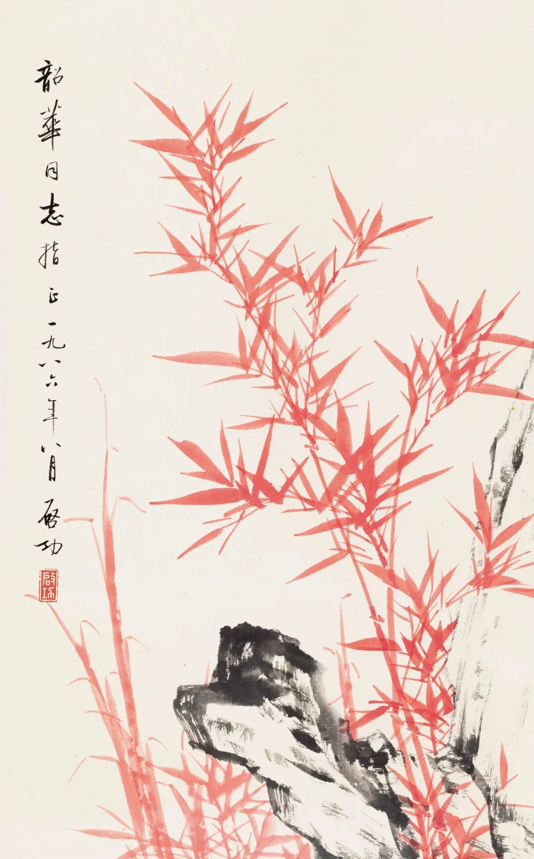 旧王孙的秋水人家,门前烟柳,有“雪衣棲卧柳”。大千居士备足“得味仙果”,邀来潘伯鹰、方节庵等好友一众“迎喜”,预祝新岁百福。昔日“渊明居下有松菊、扬子宅中老虫鱼”,缶庐之中吴昌硕为父母官朱竹石作“朱竹墨石图”,尤趣而雅矣。“好友久离别,晤言倍觉欢”,潘天寿为邱岳生写下“松居论道”,而潘天寿所书的弘一法师语“应使文艺以人传,不可人以文艺传”也正是几位大师的处事准则。傅抱石《杜甫佳人诗意》画于1945年春,正值他古意人物创作的最高峰之时,为法国驻北京大使馆军事助理专员大卫·加卢拉旧藏。《百事如意图》为傅抱石画赠王商一结婚双十纪念,经多次著录,并且由新侨船务有限公司用于制作1979年年历卡。《雾晨雪雨山水四屏》为陆俨少仅见有“传于子孙,幸毋拆散”之题跋,可见画家对此作的喜爱与重视。《蝴蝶兰》与《旭日青山》两件扇画,与此前创造齐白石最高拍卖记录的《山水十二屏》同为1925年绘赠陈子林先生。此外,今年适逢溥心畬先生诞辰125周年,开拍还带来了数件溥儒先生作品,包含山水、花鸟、人物、书法等多种题材与形制作品,集中呈现溥心畬书画艺术之菁华。Lot 707吴昌硕[1844-1927]朱竹墨石图