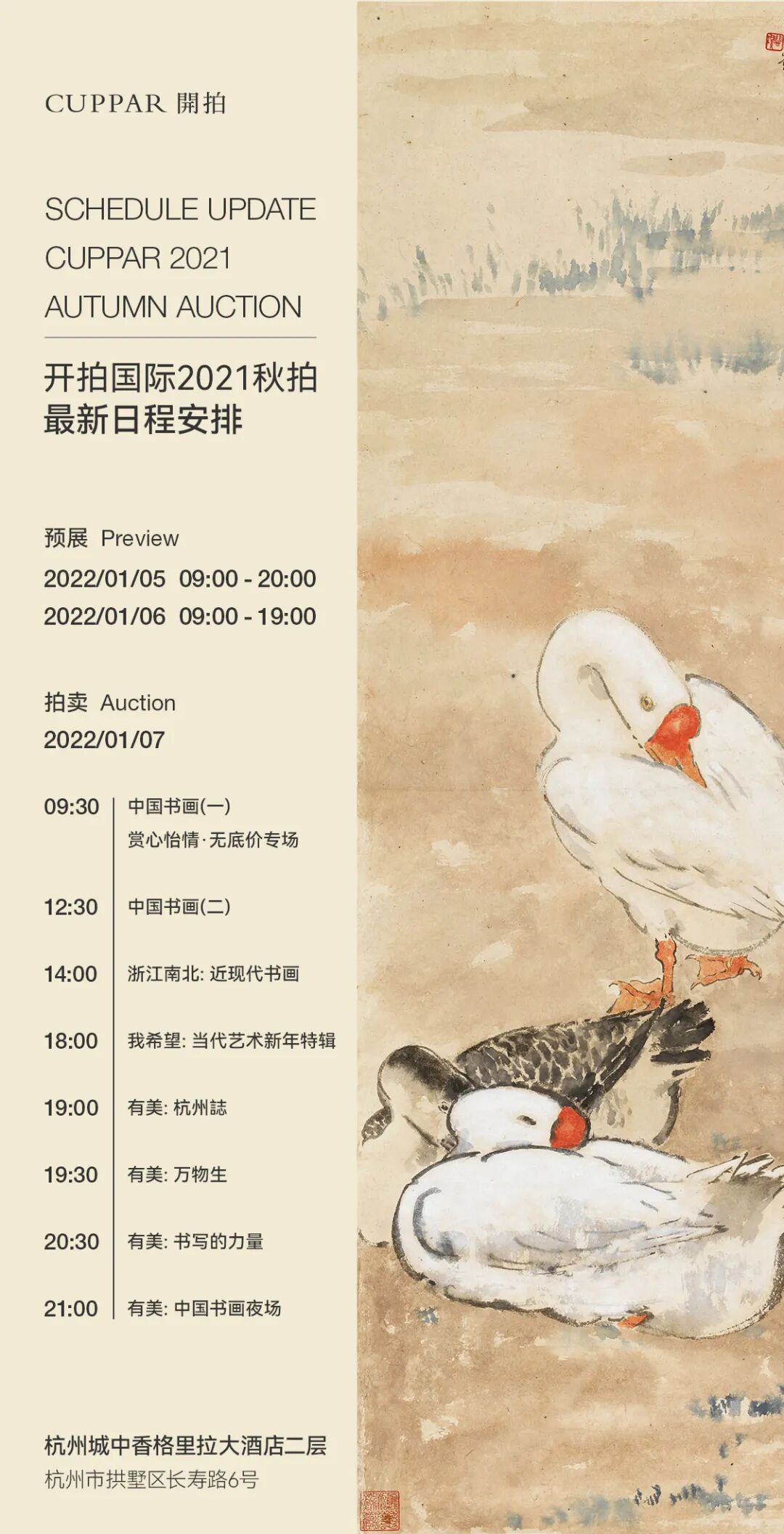 开拍国际『2021秋季拍卖会(杭州)』今日启幕,1月5日至6日举行现场预展,1月7日正式举槌开拍,预展及拍卖地点均位于杭州城中香格里拉大酒店。联拍在线将全程直播,并提供实时同步竞拍技术和服务支持。在专场设置中,开拍CUPPAR持续深耕专业门类,在四大“有美”策展夜场中呈现中国书画及现当代艺术的精彩作品,日场亦特别推出无底价“生货”专场和当代艺术新年特辑。此外,开拍还将于预展现场带来箱包奢品及瑰丽珠宝等品类的私冾展览,精彩纷呈。小编接下来将分专场对本次拍卖的重点拍品进行梳理,如需了解全部拍品,请点击文末“阅读原文”,即可浏览完整图录、参与竞拍。此次「有美:中国书画夜场」,汇聚李鱓、颠道人、吴昌硕、潘天寿、黄宾虹、张大千、齐白石、傅抱石、李可染、关山月、陆俨少、赵少昂等历代名家书画50件,皆为流传有序,出版精良之佳作。其中特推出“传意见形 : 大师的书与画”专题,呈现溥儒、张大千、吴昌硕、潘天寿、弘一、丰子恺六位大家书与画十二件佳构。