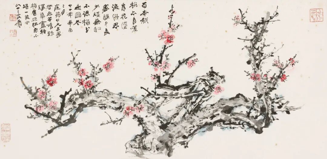 Lot 133张大千[1899-1983] 环荜庵观梅款识:百本栽梅亦自嗟,看花堕泪倍思家。眼中多 少顽无耻,不认梅花是国花。七十年辛酉二 月,庭筠仁兄方家督画并嘱录环荜盦种梅旧 作拙恶不堪一笑也,八十三叟爰。说明:朱庭筠上款。Lot 133-135,137-139 为同一上款。“松风画会:成扇专题”汇集溥伒、溥佺、溥儒、溥修、王福庵、马晋、陈少梅、周肇祥等人合作扇面。“寿侪金石:金石书法专题”,涵盖了金石拓片、金石家书画等十八件拍品。“康有为梁启超书法专题”汇集到康梁二公计十件书作,二人名为师徒而书风迥异,一静一动,生动表现出二人之性格秉性之差异。“民国书法专题”汇集了那个风雨飘摇的时代中的领舵者、弄潮者、失意者、随波逐流者……另有齐白石、金城、奚冈、黄均、王雪涛、黄胄、周思聪等人画作,共同构成中国书画之大观。Lot 258齐白石 [1864-1957]花下安居图拍品估价:180,000 - 250,000 人民币