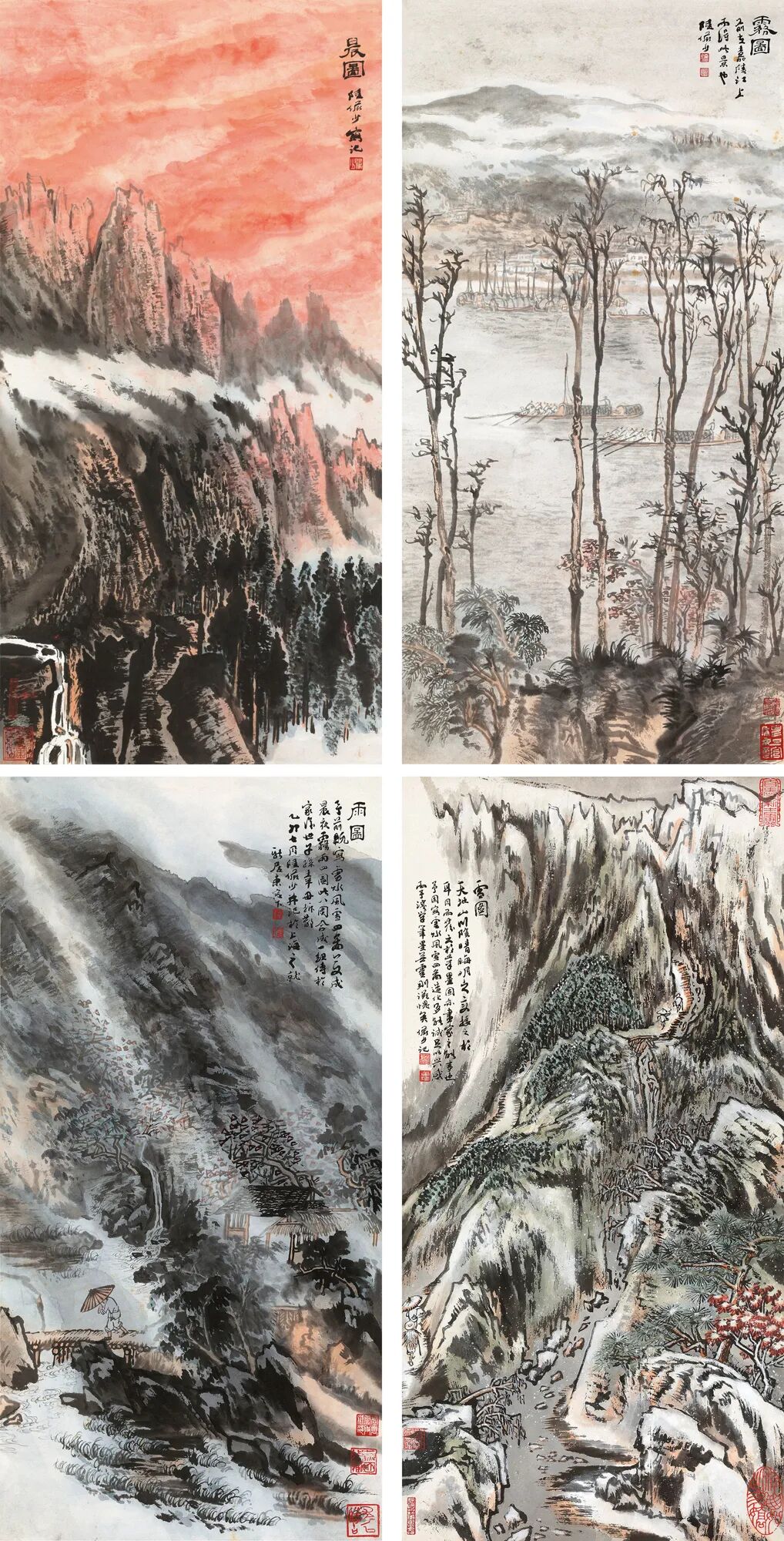 Lot 722陆俨少[1909-1993]雾晨雪雨山水四屏拍品估计:8,000,000 - 10,000,000 人民币3.雪图。天地山川阴晴晦明之变,接之于耳目而发之于笔墨,固亦画家之能事也,予因写云水风雪四图,造化多能,诚足以兴感,而予浅学笔墨,无灵则滋,愧矣,俨少记。4.雨图。予前既写云水风雪四图,今又成晨夜雾雨四图,此八图合成一组传于家,后世子孙幸毋拆散,乙卯七月,陆俨少并记于上海之就新居东窗下。鉴藏印:燕因收藏、朱燕因藏记、虚怀斋收藏印、虚怀斋珍藏书画印、虚怀斋1.《山水画刍议》图二四、二五、二六、二七,上海人民美术出版社,1980年。2.《荣宝斋画谱(二十)山水部分·陆俨少》,荣宝斋出版社,1994 年。3.《陆俨少全集》第三卷第195、196、198、200页,浙江人民美术出版社,2008。4.《虚怀斋藏陆俨少书画集》,第 292—299 页,上海人民美术出版社,2008 年。5.《古越轩藏画》第28-31页,中国美术学院出版社,2010年。6.《画余杂缀:陆俨少诗文题跋集》第117页,浙江人民美术出版社,2019年。展览:“ 虚怀斋藏陆俨少作品展”,保利艺术博物馆,2010年4月9日至16日。