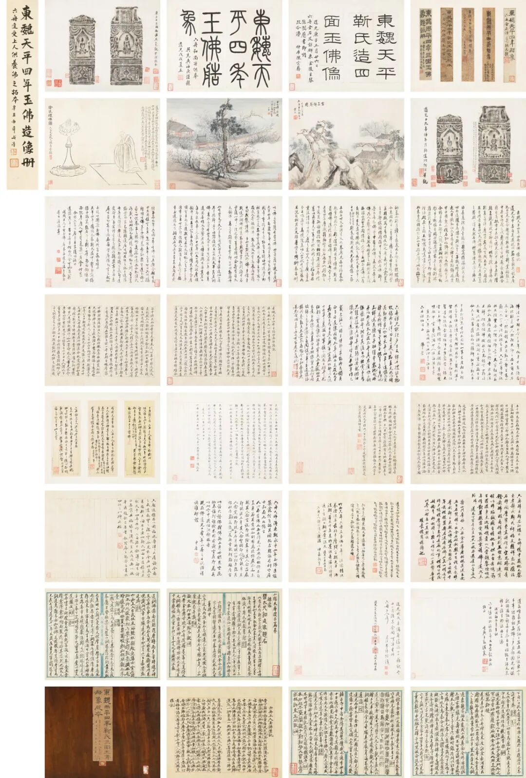 尺寸:35.3×28.3 cm×31,约 0.9 平尺(每幅)1.东魏天平四年玉佛造象。道光庚子(1840) 三月甘六日,六舟金石友访碑来金陵,主琴隐园属书,即请政分法,仲虎陈宗。【钤印】彝【鉴藏印】玉庐主人2.东魏天平四年玉佛造像。六舟和尚所供奉,巽先吴汝庚谨题,道光戊戌 (1838) 夏五。吴汝庚印【鉴藏印】玉庐主人1.庚子(1840) 七月朔,南海吴荣光观于沧浪亭。【钤印】吴荣光、荷屋鉴藏印:磨砖作镜、海昌释达受六舟珍藏之印、积古斋、叔书父、黄晋、海昌钱镜塘五十以后所 得乡贤遗迹记、虫达、玉庐主人2.此玉造像为东魏靳氏所造,有名用事者,盖以《史记屈原传》有:“用事者臣新尚。”即靳氏典故耳。道光己亥(1839) 九月,翁大年注。【钤印】翁大年印、叔均3. 道光十九年(1839) 仲冬月朔,道州何绍基观。【钤印】何绍基印、子贞【鉴藏印】王渔见过、赵之琛 印、所白印、达受、释六舟长物、石昌山馆印、海昌佛子达受敬奉、吴汝庚、李兆洛印、予樵经眼、天平玉佛庵弟子达受印、玉庐主人鉴藏印:磨砖作镜、海昌释达受六舟珍藏之印、积古斋、叔书父、黄晋、海昌钱镜塘五十以后所得贤遗迹记(2 次)、虫达、王渔见过、赵之琛印、所白印、达受、释六舟长物、石昌山馆印、海昌佛 子达受敬奉、吴汝庚、李兆洛印、予樵经眼、天平玉佛庵弟子达受印、玉庐主人(14 次)、海 昌钱镜塘藏(2 次)、镜塘珍藏、海昌钱镜塘收藏乡贤遗象记、耳园(4 次)出版:《六舟东魏天平四年四面玉佛造像脱本》,西泠印社出版社,2022年。(即将出版)1.《宝铁斋诗录》第67-68页,(撰)韩崇,清道光二十九年(1849)刻本。2.《六舟集》第296页,浙江古籍出版社,2015年。1.本册经胡佐卿(1901-1979)、钱镜塘(1907-1983)递藏。2.本册为六舟自留版本,其于道光十八年(1838)自题所得经过,并于咸丰七年(1857)重题笺条。3.册后六舟补录徐楙、张廷济、刘喜海等 18 家《小绿天庵搜古篇卷·造像·晋太元铜造像题名》四开。4.本册题签者阮元、严可均、吴汝庚、冯登府、六舟;题名者陈宗彝、吴汝庚;绘《古玉佛庵图》 者几谷、黄均;补像者陈庚;题跋鉴赏者何绍基、赵之琛、瞿中溶、陈文述、吴荣光等 20 家。5.2021 年 11 月净慈寺住持戒清法师题签。