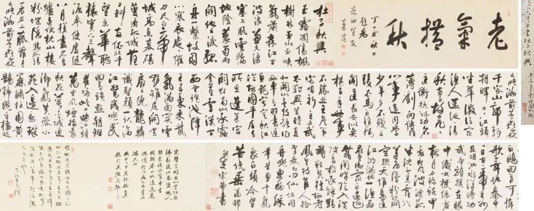 Lot 526宋曹[1620-1701]行书杜甫秋兴八首诗卷【本幅】30.5×515 cm,约 14.1 平尺拍品估价:1,200,000 - 1,500,000 人民币引首:老气横秋。丁酉秋日题为芝田贤友,叶潢。【钤印】叶潢之印、雪舟、崇雅1. 宋曹字彬臣,一字邠臣,号射陵,江南盐城人。明崇祯时官中书,国朝举山林隐逸,荐鸿博,俱以病不出,书名满天下。咸丰甲寅秋,徐三庚录于吴趋客邸。【钤印】徐三庚私印、于鱼得计2. 宋彬臣,崇祯进士,亡国之后晦迹山林全其节,不失为明遗民,其志不可与王孟津、张二水并论。此卷书杜少陵秋兴八首,笔致潇洒,亦可喜也。天江查客识。【钤印】天江樝客、江马圣钦、秋水芙蓉笔砚香题签:宋曹草书杜子秋兴。庚辰三月素轩居士。【钤印】素、轩展览:“别有洞天:盐城博物馆新馆开馆展览”,江苏盐城市博物馆,2021年9月16日。1.叶潢,字天来,号息洲,无锡诸生,晚年尤长于行草。着有《石溪草堂诗》四卷。2.徐三庚(1826-1890),清代篆刻家。字辛谷,又字诜郭,号井罍,又号袖海,别号金罍山民、似鱼室主、馀粮生,浙江绍兴上虞西山人。精于金石文字,善篆隶篆书。3.江马天江(1825-1901),日本人。本名下坂圣钦,号天江。德川末期勤王诗人。擅长诗、书、画、鉴定。日本中国古书画鉴定权威。