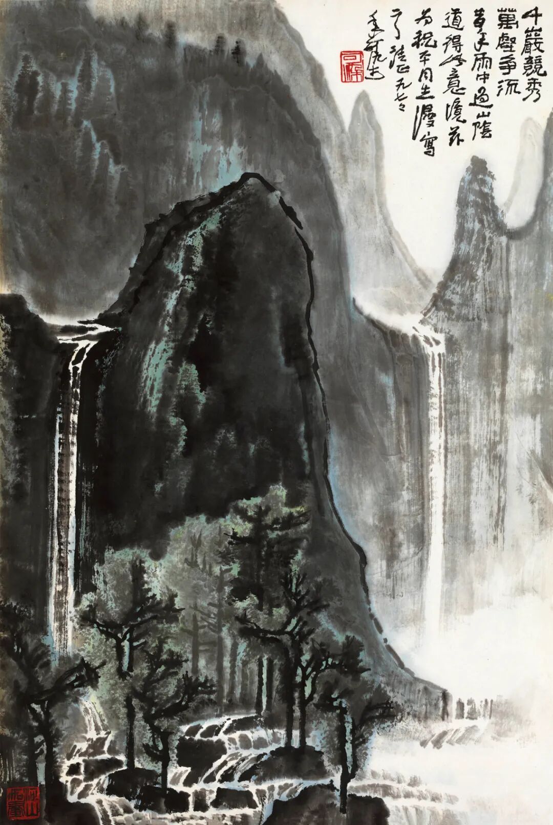Lot 720李可染[1907-1989]千岩竞秀 万壑争流拍品估价:1,800,000 - 2,000,000 人民币款识:千岩竞秀,万壑争流。昔年雨中过山阴道得此意境,兹为祝平同志漫写之请正。一九七七年,可染。1.《可染墨韵之千岩竞秀精品》图版24,保利艺术博物馆,2010年。2.《嘉德二十年精品录:近当代书画卷-四》,图1189,故宫出版社,2014年。1.“可染墨韵之千岩竞秀精品展”,保利艺术博物馆,2010年。2.“中国近现代书画十二大名家精品展”,保利艺术博物馆,2011年。说明:此作品 2011年10月经李小可先生鉴定为真迹。