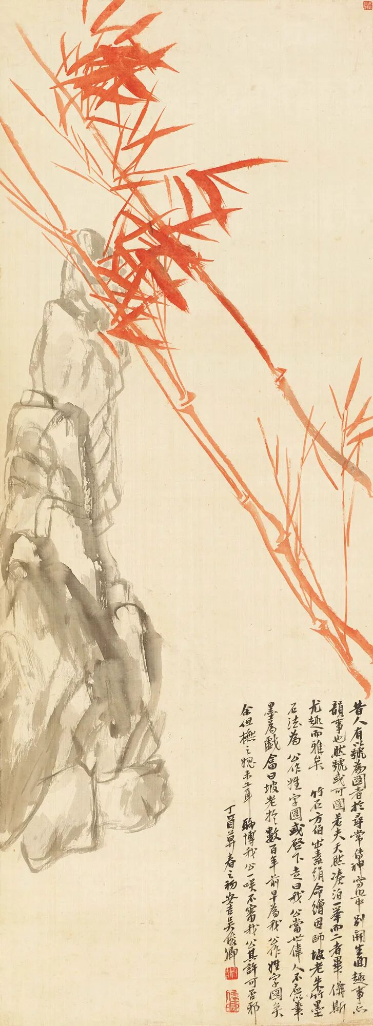 拍品估价:800,000 - 1,000,000 人民币款识:昔人有以号为图者,于寻常傅神写照中,别开生面,趣事韵事也!然号或可图,若夫天然凑泊,一举而二者毕备,斯尤趣而雅矣。竹石方伯出素绢命绘,因师坡老朱墨石法为公作姓字图,或启下走曰:我公当世伟人,不应以笔墨为戏。合曰:坡老于数百年前早为我公作姓字图矣,余但抚之,恕未工耳!聊博我公一咲,不審我公其可否邪!丁酉暮春之初,安吉吴俊卿。1.《中国古代书画图目》第 12 册(文物出版社,1993),页120(沪 8-145)。2.陶小明,《浙江四大家》(西泠印社出版社,2011),页10。3.郑以墨,《中国艺术大师图文馆·吴昌硕》(山西教育出版社,2010)页18。1.劳继雄,《中国古代书画鉴定实录 4》(东方出版中心,2011),页1843。(鉴定意见:真迹,精)2.朱关田,《吴昌硕年谱长编》(浙江古籍出版社,2014),页 146。3.朱关田,《吴昌硕纪年书法绘画篆刻录》(浙江古籍出版社,2014),页334。4.杨仁恺,《中国古代书画鉴定笔记》第 4 卷(辽宁人民出版社,2015),页1540。5.刘九庵,《刘九庵书画鉴定研究笔记》第 9 卷(故宫出版社,2020),页3754。2.朱之榛(1840-1909),浙江平湖人,字仲蕃,号竹石。同治年间以父荫出仕,后长期任职於苏州。从吴昌硕的款题可知,此幅《朱竹墨石图》正是朱之榛出素绢向吴昌硕索绘的。并且,此次索绘也并非是单纯索要吴昌硕的字画,而另外还有主题的限制。即因朱之榛所号为“竹石”,所以特别请吴昌硕绘制一幅对应的别号图。值得注意的是,吴昌硕在接受朱之榛的委托时,并没有使用画竹最常见的“墨竹”进行绘制,而是选择了红色的“朱竹”进行表现。此即展现了吴昌硕的细心之处,即朱之榛所姓为“朱”,又号“竹石”,所以吴昌硕才选择了特殊的“朱竹石”主题来进行绘制。