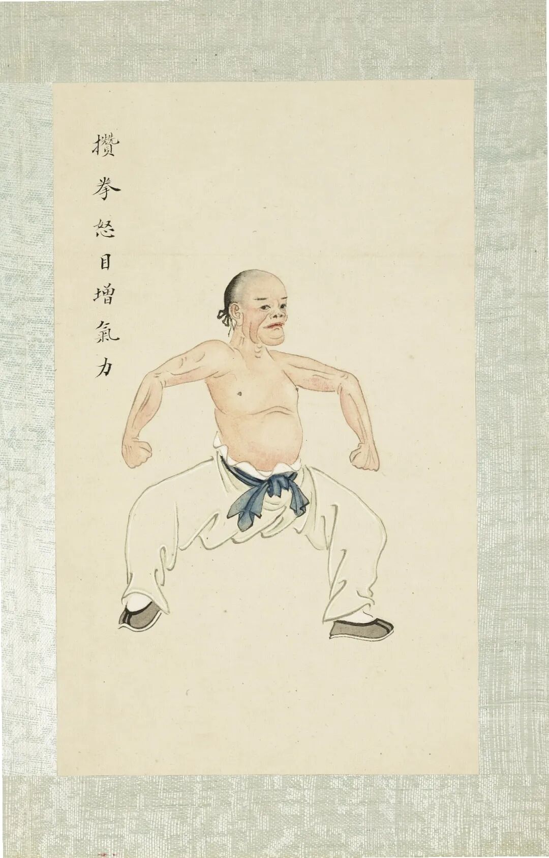 7.攒拳怒目增力气:两足横开,两膝下蹲,呈"骑马步"。双手握拳,拳眼向下。顺势头稍向左转,两眼通过左拳凝视远方,右拳同时后拉。与左拳出击形成一种"争力"。随后,收回左拳,击出右拳,要领同前。反复六次。