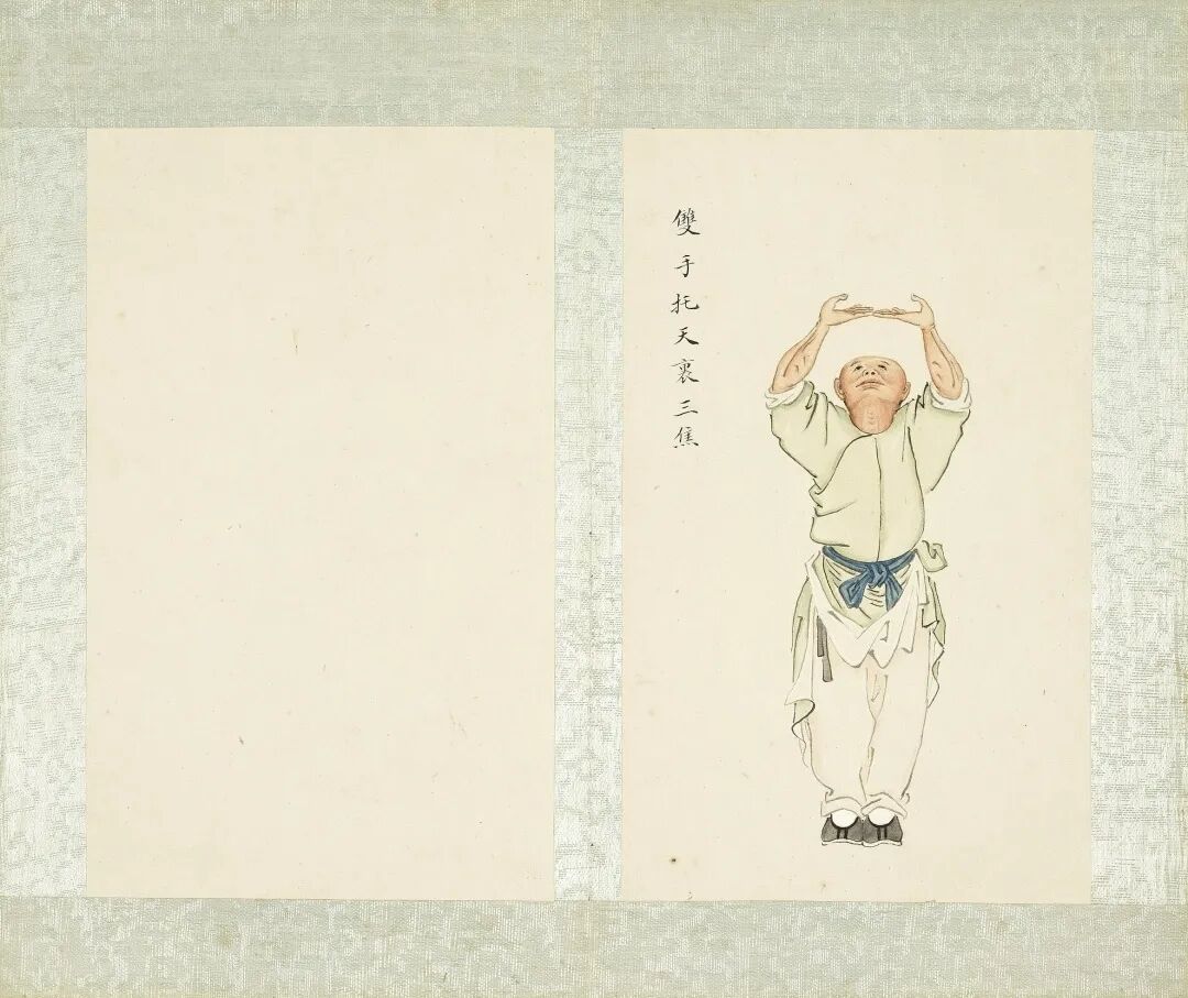 1.双手托天理三焦:自然站立,两足平开,与肩同宽,含胸收腹,腰脊放松。正头平视,口齿轻闭,宁神调息,气沉丹田。双手自体侧缓缓举至头顶,转掌心向上,用力向上托举,足跟亦随双手的托举而起落。托举六次后,双手转掌心朝下,沿体前缓缓按至小腹,还原。