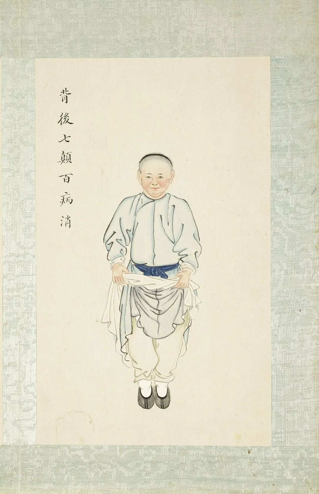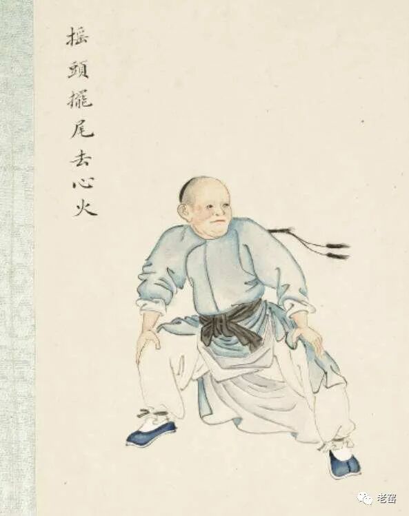 5.摇头摆尾去心火:两足横开,双膝下蹲,成"骑马步"。上体正下,稍向前探,两目平视,双手反按在膝盖上,双肘外撑。以腰为轴,头脊要正,将躯干划弧摇转至左前方,左臂弯曲,右臂绷直,肘臂外撑,臀部向右下方撑劲,目视右足尖;稍停顿后,随即向相反方向,划弧摇至右前方。反复六次。